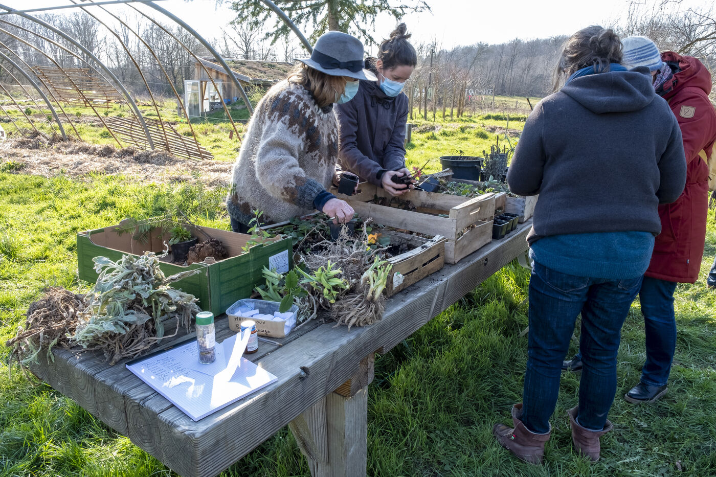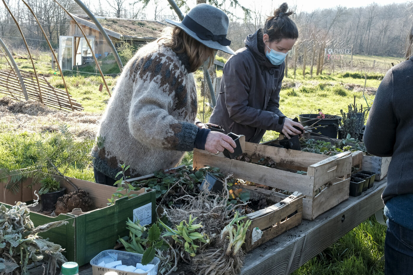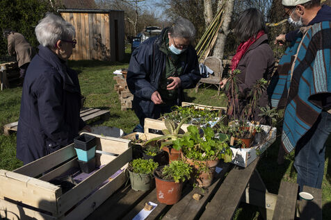 Des adhérents de l'association se retrouvent dans le jardin partagé pour échanger des plantes et dans la salle des fêtes de Mézilles pour échanger des graines.