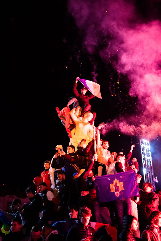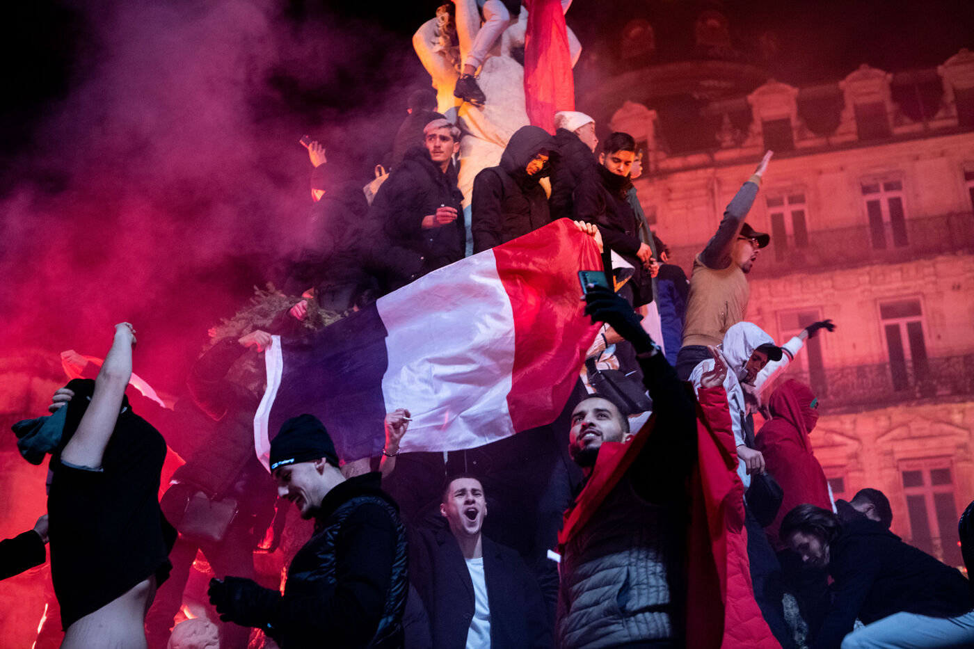 France, Montpellier, 2022-12-10. Fans celebrate the victory of France and Morocco in the quarter-finals at the Place de la Comedie. Photography by Iselyne Perez-Kovacs / Hans Lucas.