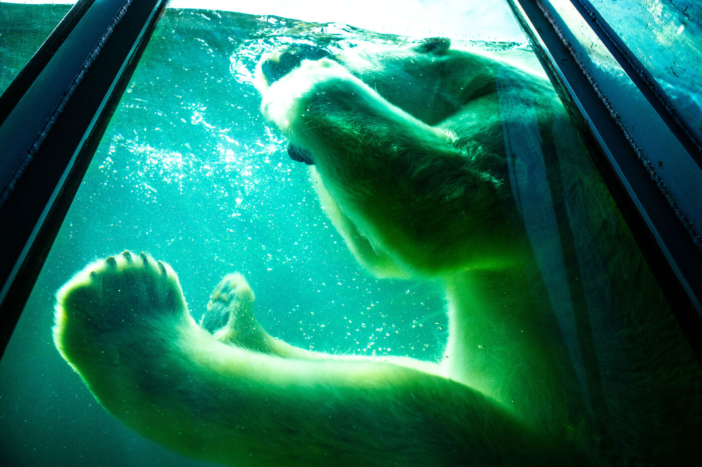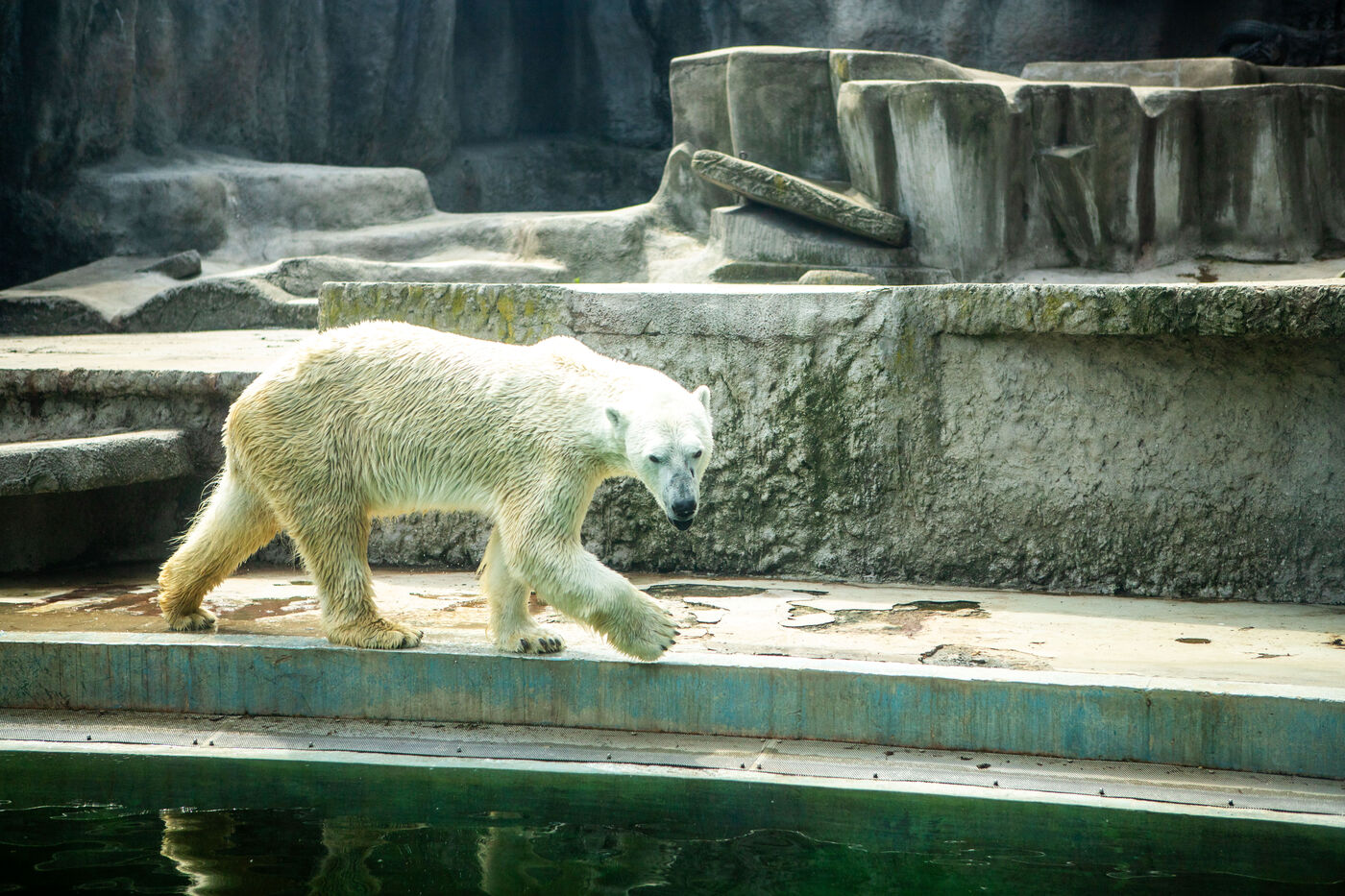 Hongrie, Budapest, 2023-07-17. Un ours polaire, des manchots et un phoque en captivité au zoo de Budapest. Photographie par Iselyne Perez-Kovacs / Hans Lucas.