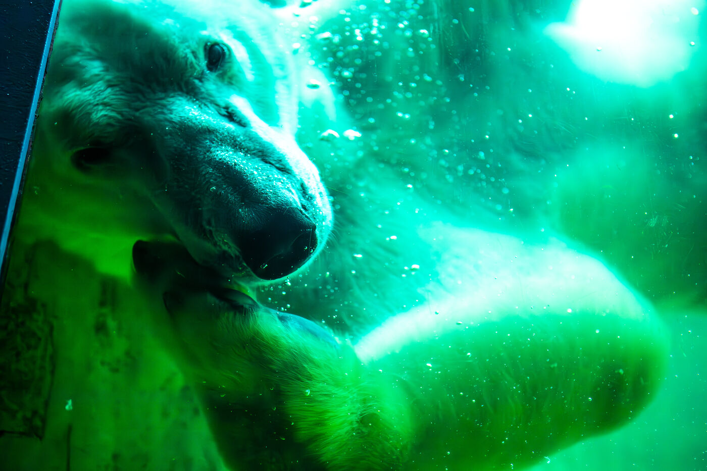 Hungary, Budapest, 2023-07-17. A polar bear, a penguin and a seal in captivity at Budapest Zoo. Photography by Iselyne Perez-Kovacs / Hans Lucas.