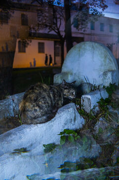 Maroc, Tanger, 2023-12-04. Les felins de Tanger naviguent entre appartenir à la communaute citadine et être depourvus de foyer. Ils arpentent les rues, les commerces, les lieux de restauration et meme les cimetieres. Bien que certains veillent à leur alimentation, l'observation revele de nombreuses maladies et blessures parmi eux. Photographie par Iselyne Perez-Kovacs / Hans Lucas.