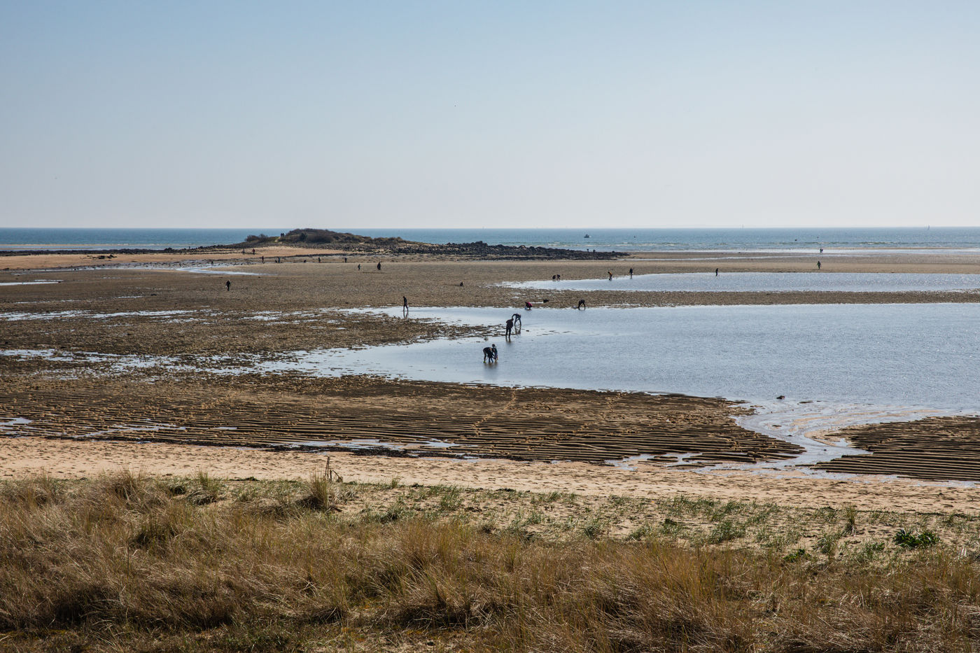 Du 28 février au 3 mars c'est les grandes marées en Bretagne, coefficient maximal de 106 ce lundi 1er mars. Une journée parfaite et très ensoleillée à la plage du Men Du à la La Trinité-sur-Mer à la frontière de Carnac-Plage. Cette plage a l'énorme avantage d'avoir une pente très douce. La mer se retire alors très loin pour le plaisir des pêcheurs à pieds. Sur cette plage on pêche principalement des coques, des bigorneaux, des moules, des huitres sauvages, des étrilles et des palourdes. C'est un écosystème fabuleux et il est important de respecter notre environnement et de ne pas ramasser n'importe quoi. Il y a des tailles de capture à respecter. Il existe des réglettes pour mesurer la bonne taille des coquillages pour que l'on puisse pêcher encore longtemps.