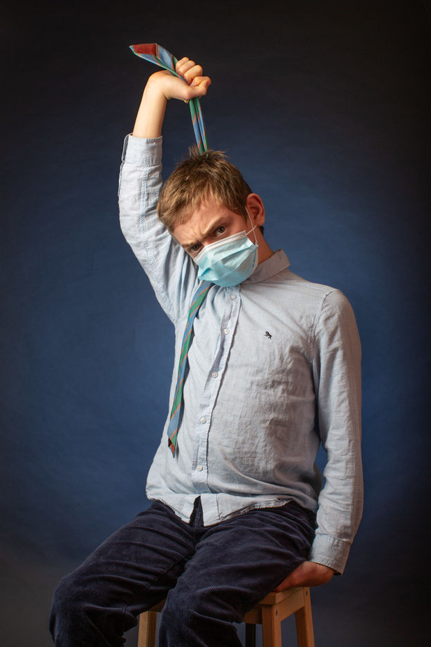 Un adolescent joue avec son masque, sa cravate, son pull.