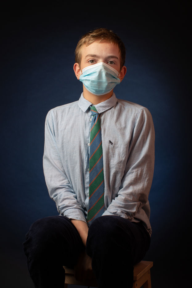 During the lockdown nothing is easy for children and teenagers. A series of images where the boy expresses several emotions with what he finds, mask, tie, jumper and a flower crown.