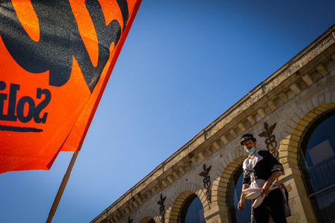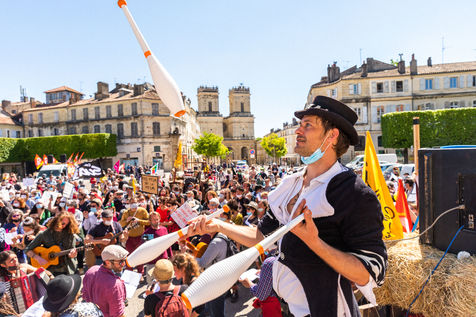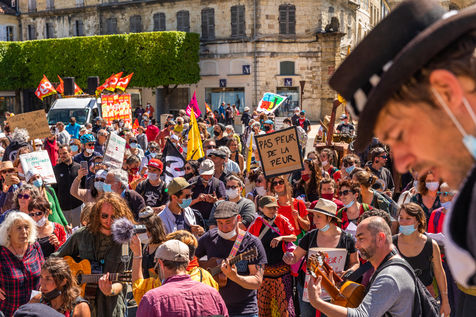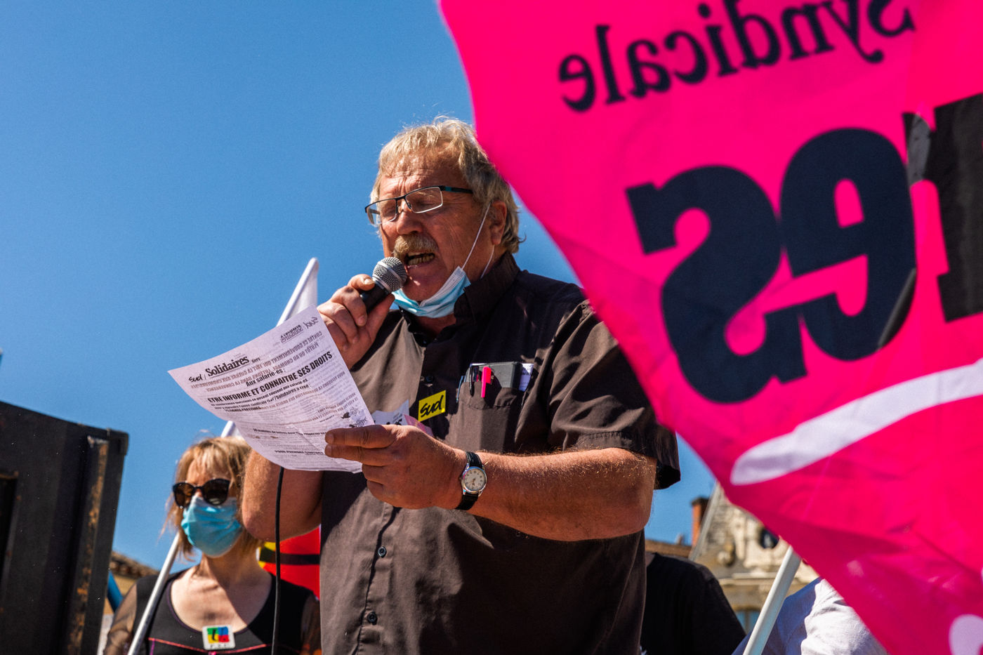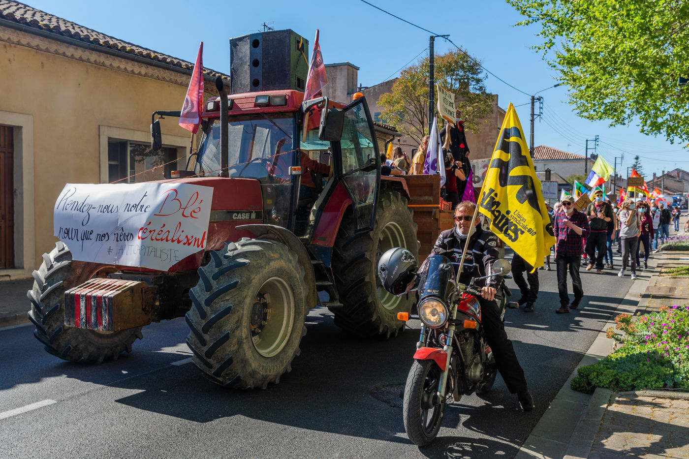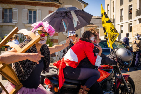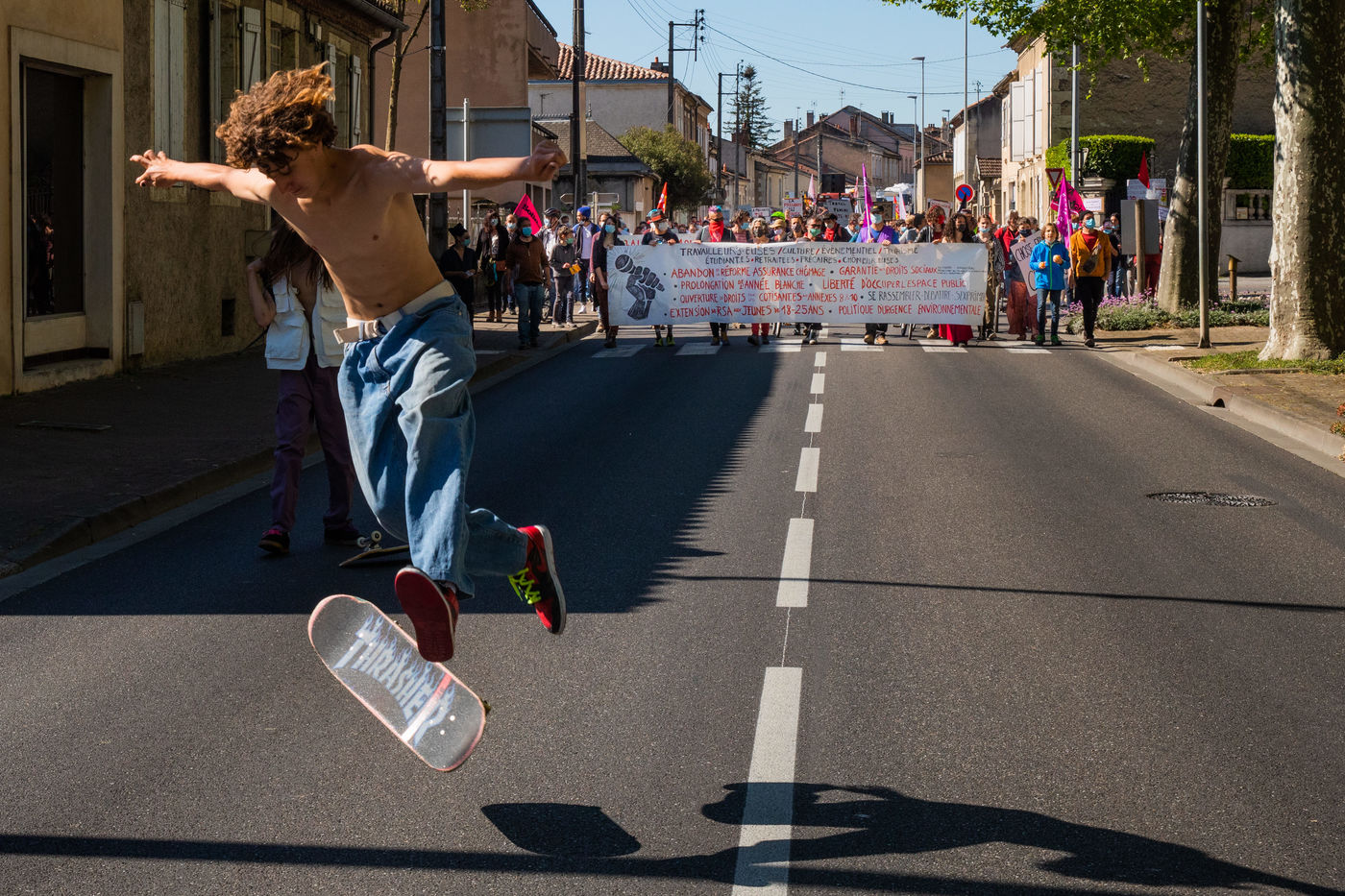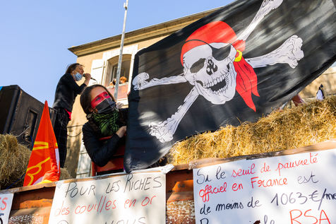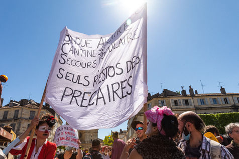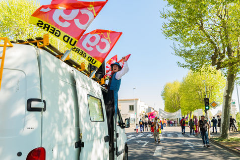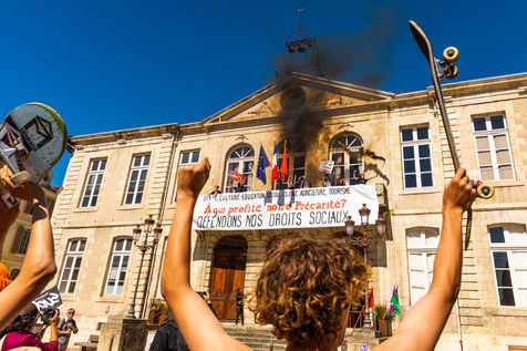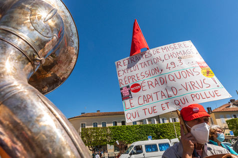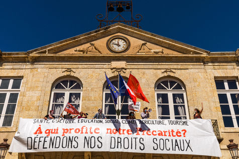 Auch, France on 23 April 2021. Demonstration in Auch yesterday morning. This is a general mobilization against the reform of the unemployment insurance in convergence with all sectors (agriculture, education, health, culture, tourism, social, etc.) and all people affected by precariousness. This call was launched by the Sud Solidaires / CGT / FSU / Occupant.e.s,... They will be joined by many sectors in struggle (health, culture, education, agriculture, etc.) and by the Yellow Vests. The occupiers of Circa-Ciné32, militate for the co-construction of a direct democracy. In this perspective, they carry out actions in favour of social, ecological, educational, feminist causes, etc. (list not exhaustive).