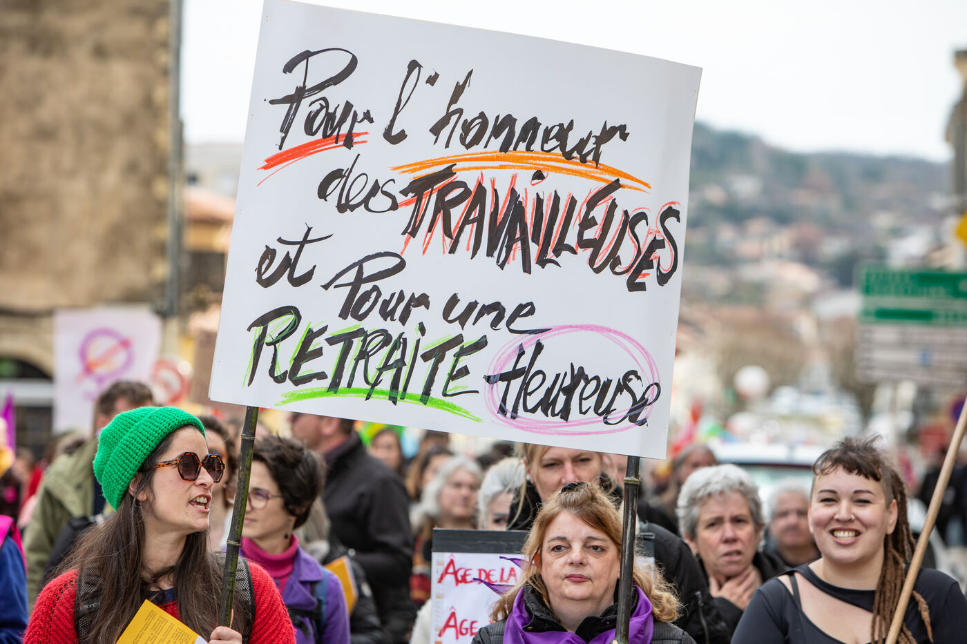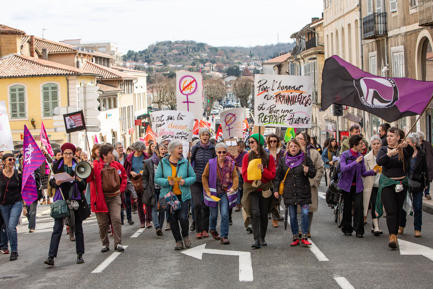 There were fewer people than on 7 March (around 480) and no elected representatives seemed to be present! Towards the end of the demonstration, a symbolic cheque for 5.5 billion euros was presented, which, according to the CGT, corresponded to the additional resources of the pension scheme if women were paid the same as men. This fictitious cheque points to the difference between men's and women's wages. It was taped to the gate of the prefecture of Auch to show that this sum would finance half of the 12 billion deficit mentioned by the government. Speeches and chants such as "Stand up for women", "Antipatriarchy" and "Revolution" were chanted by the demonstrators. Many women pensioners were present to highlight these inequalities for future generations. For decades now, women have been fighting for their rights, fighting against gender-based violence, and demanding the same salaries and yet they still have to fight for the same rights for men and women...