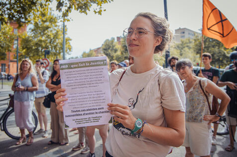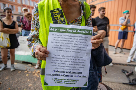 Activists, zadists and MPs took the floor to demonstrate the abuse of power, the dangers and the violence of the forces of law and order against people opposed to the illegal tree-cutting of the A69 motorway project in front of the courthouse as a strong symbol in Toulouse on 31 August 2024.