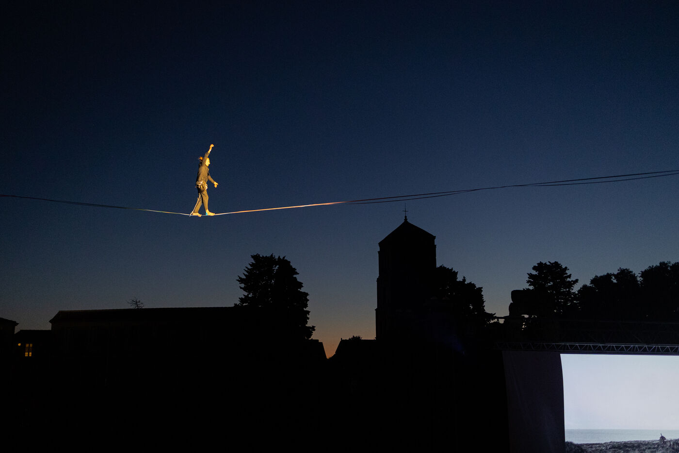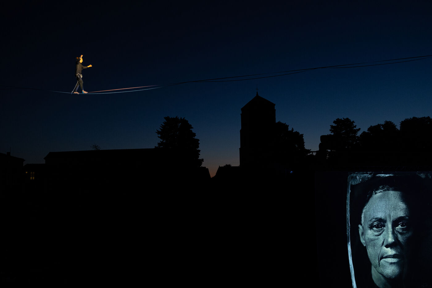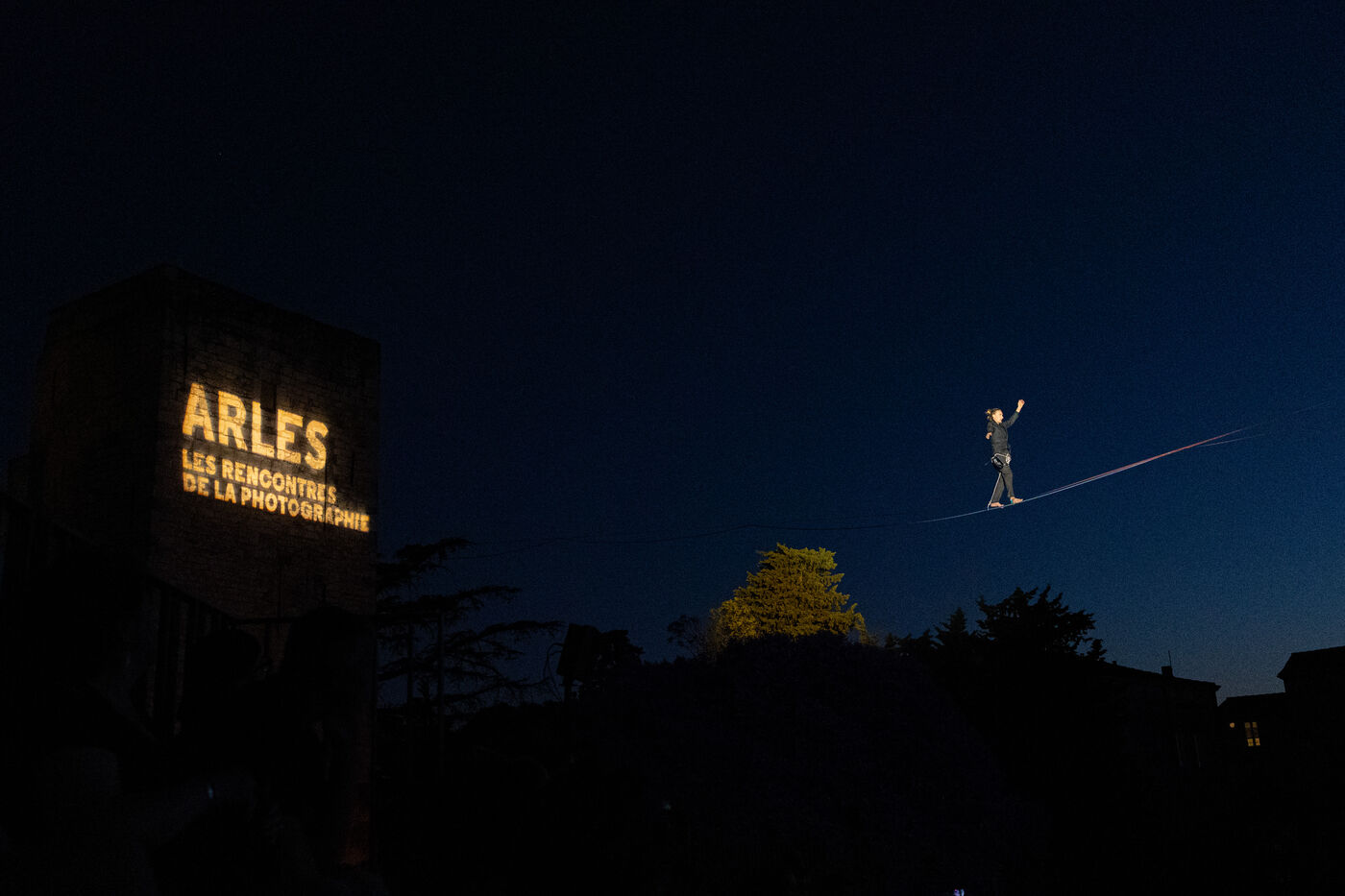 From the very first moments, the audience was captivated by a breathtaking aerial performance by the Gratte Ciel company. Two tightrope artists floated gracefully through the air, suspended in front of a massive screen where images from the festival’s exhibitions were projected. A spectacular staging — with shadows dancing across the photographs — mesmerized the 2,500 spectators gathered at the foot of the stage, drawn by the promise of an unforgettable evening and the exceptional presence of Nan Goldin, recipient of the 2025 Women in Motion award honoring female photographers.