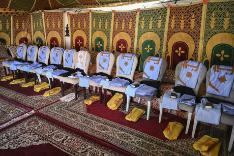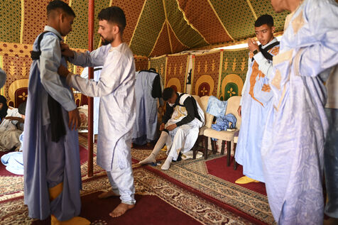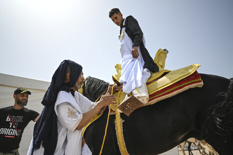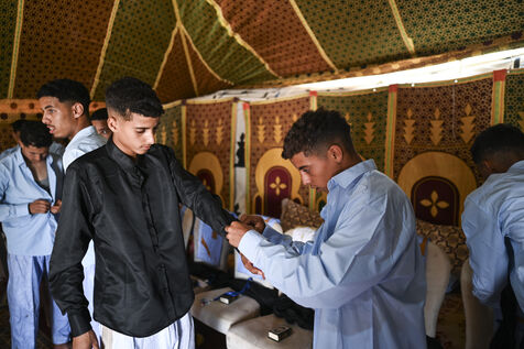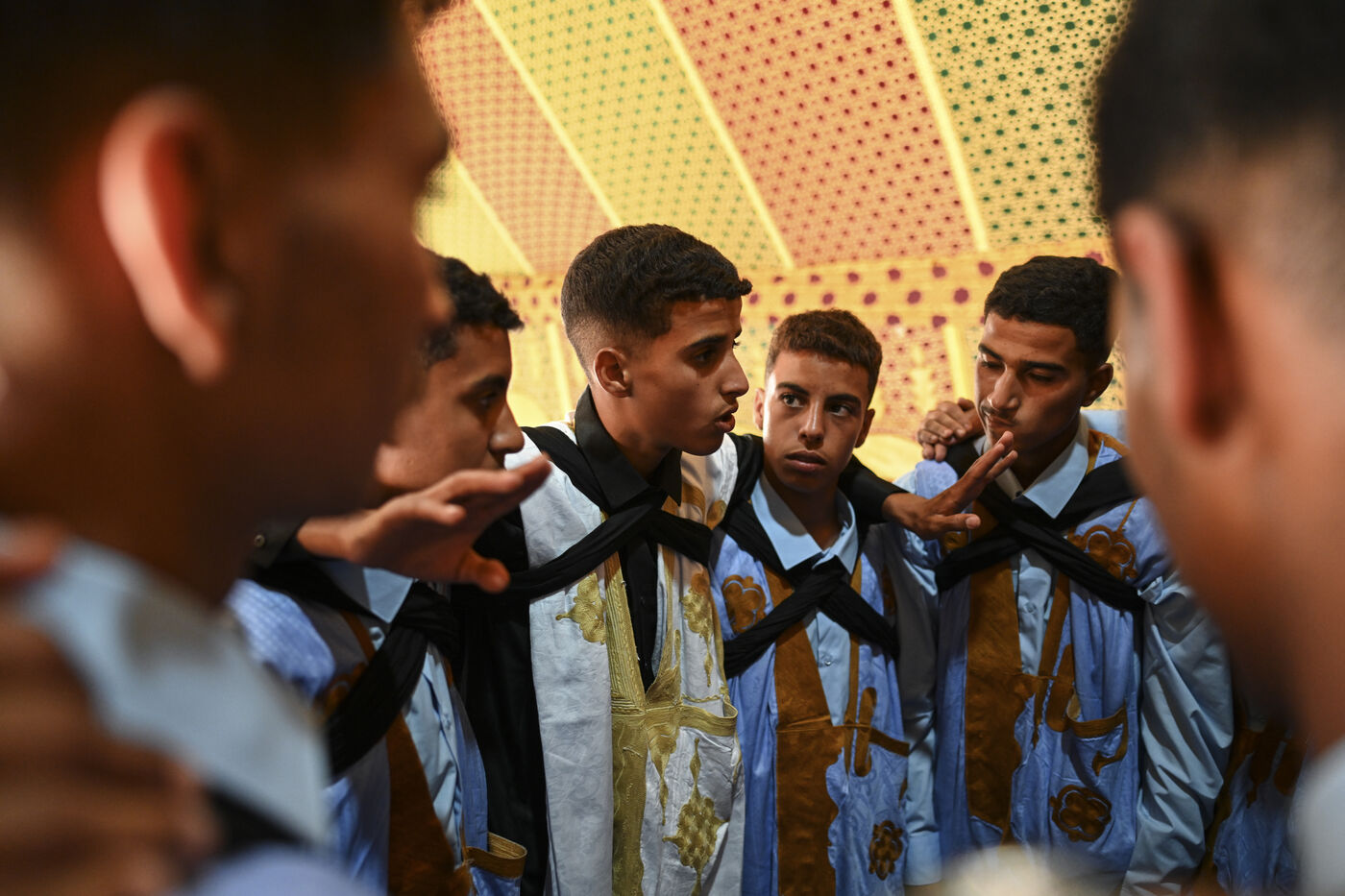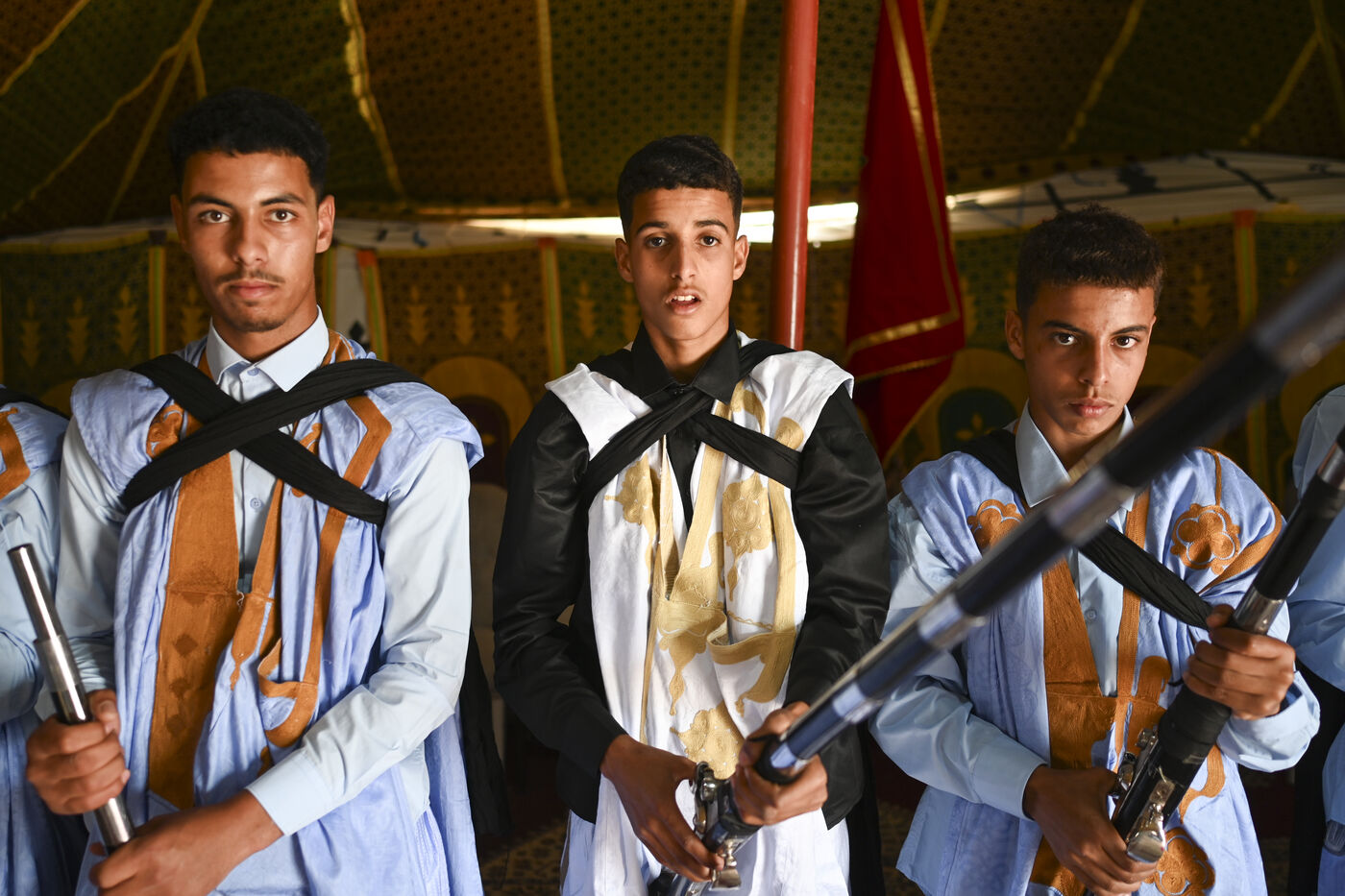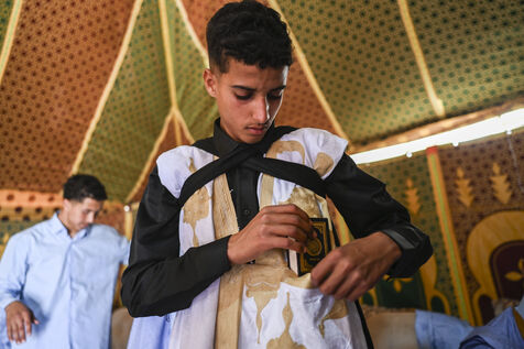 Inside a traditional Moroccan tent, the story unfolds. Tbourida uniforms are carefully laid out: draâ, trousers, belt, yellow slippers, and copies of the Quran. In this symbol-laden space, young riders help one another dress and prepare, performing a collective ritual that reinforces discipline and solidarity. At the heart of this preparation stands El Aaida Hassan, a young Moqaddem from the Guelmim-Oued Noun region, responsible for leading his Sorba with rhythm, visual harmony, and moral authority.