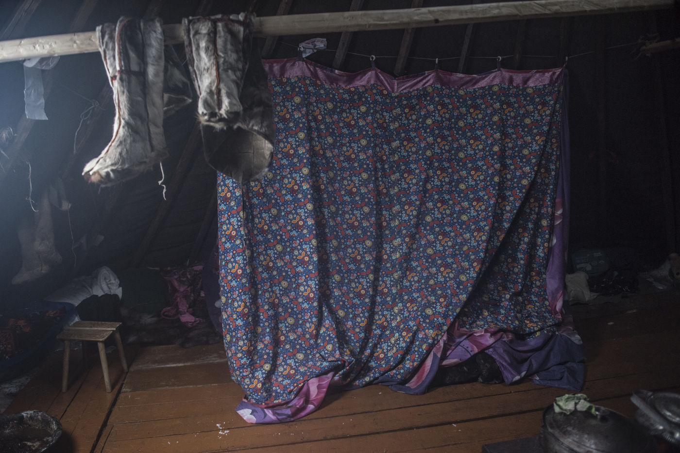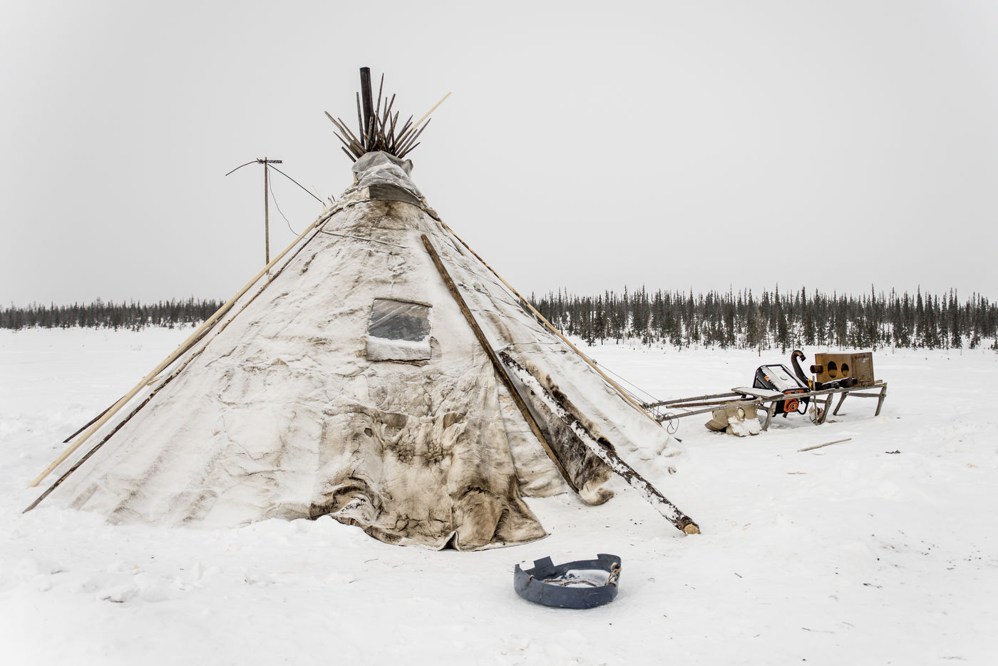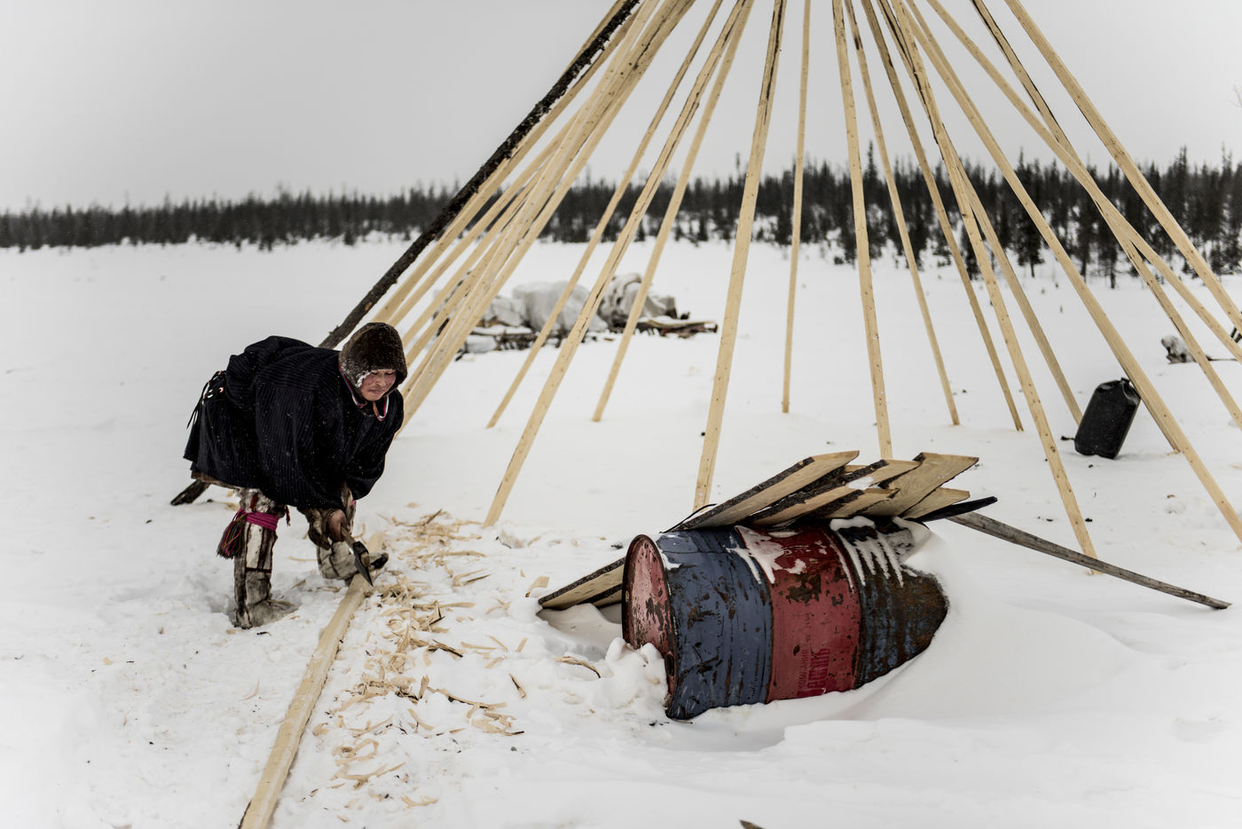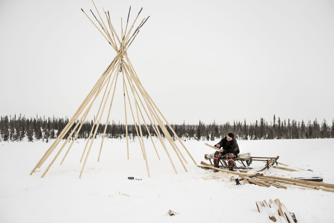 Il est important de pouvoir monté le camp rapidement en cas de tempête. La structure des tchoums se doit d'être légères et facilement transportables. Elle demande une vingtaine de troncs de conifères et une centaine de peaux de rennes. Cette simple structure, recouverte de son manteau et le lieu de vie principal des Nenets de Sibérie Occidentale.
