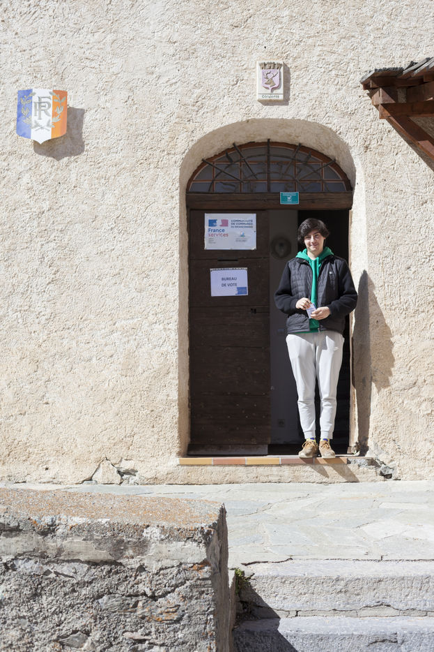 Cervieres, Hautes-Alpes, 10 avril 2022 : Noé, qui a eu 18 ans en début d'année, vote pour la première fois de sa vie, lors de l'élection présidentielle. Pour ce premier tour, il se dit content d'avoir participé au choix du futur président de la République. Présent aussi au dépouillement, il trouve que le processus est plus simple qu'il ne l'avait imaginé, mettant la démocratie à portée de main. Bien que déçu des résultats et surpris qu'au village les voix soient autant éparpillées, il votera au second tour et compte s'informer d'ici-là sur les programmes des candidats finalistes.
