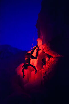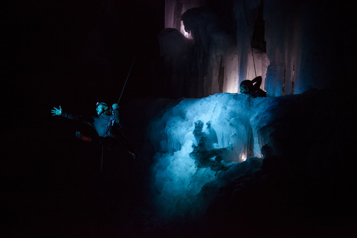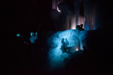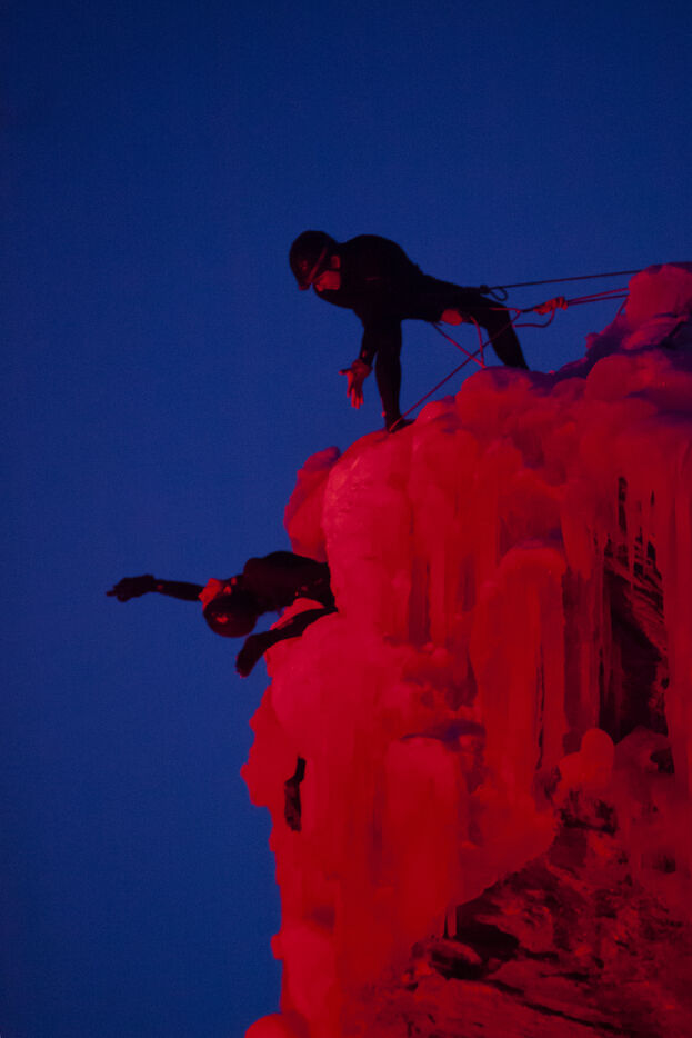 Choregraphic creation in natural space, on ice falls, Antoine Le Menestrel et Thibault Cattelain