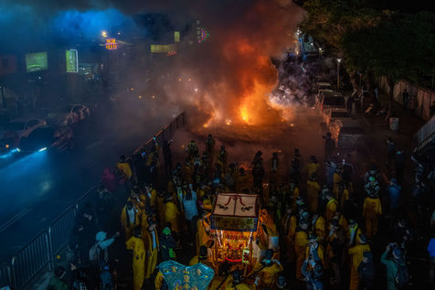 King Qinshan est l un des plus grands festivals taoistes taiwanais, qui s est tenu ce week-end, loin de toute preoccupation liee a la Covid qui y a ete jugulee de maniere exemplaire. Il s agit du " grand festival rituel du roi Qingshan ", a Taipei. Le palais du roi Shangong est un temple magique dedie a la principale divinite, le " Roi Qinshan ", le dieu qui elimine les fleaux et les catastrophes pour le peuple. La legende veut que le Roi Qinshan envoie ses generaux en voyage nocturne pour inspecter les lieux, recompenser les bonnes actions et punir le mal, et attraper les esprits qui font souffrir le peuple pour les purifier. Autrefois, l atmosphere de la deambulation etait solennelle et calme, et les gens marchaient tranquillement la nuit pour minimiser le bruit et la clameur. De nos jours, les visites inopinees sont progressivement devenues plus vivantes, jusqu a atteindre leur paroxysme cette annee avec plus de feux d artifices et de petards que jamais.