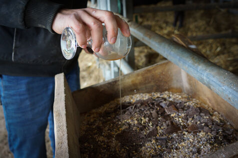 À leur retour à Auros, les génisses vont à la reproduction, et les boeufs retrouvent l'étable pour y être engraissés. « La finition dure dix mois pour les Bazadaises et 18 mois pour les Wagyus », précise Pierre-Julien qui, en devenant éleveur bovin, s?est découvert une passion pour l'alimentation et l'engraissement de ses animaux. « J'ai conçu une base de nutrition avec l'aide d'une nutritionniste, puis je l?ai faite évoluer au fil de mes rencontres avec des éleveurs de Wagyus. J'apporte beaucoup d'importance à la rigueur alimentaire, comme les athlètes ou les pâtissiers. Une mesure est une mesure. Nous pesons tous les ingrédients de la ration pour obtenir une ration quotidienne précise, distribuée à la mesure près. L'excellence est un ensemble de détails qui ne se voient pas forcément au premier coup d'oeil. » La portion journalière des boeufs va ainsi augmenter progressivement pour passer du 100 % herbe Mayennaise aux 100 % céréales Girondines.