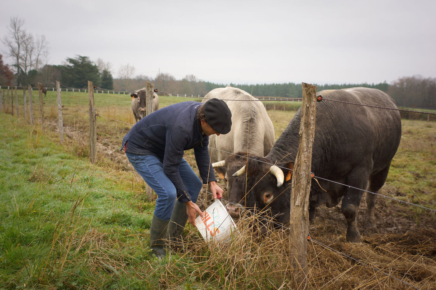 In Auros, Gironde, Pierre-Julien Allard takes great care of his herd of Bazadaise cattle. Raised like a grand cru, the steers and heifers gorge themselves on meticulously prepared cereal rations and drink two glasses of Sauternes must a day.