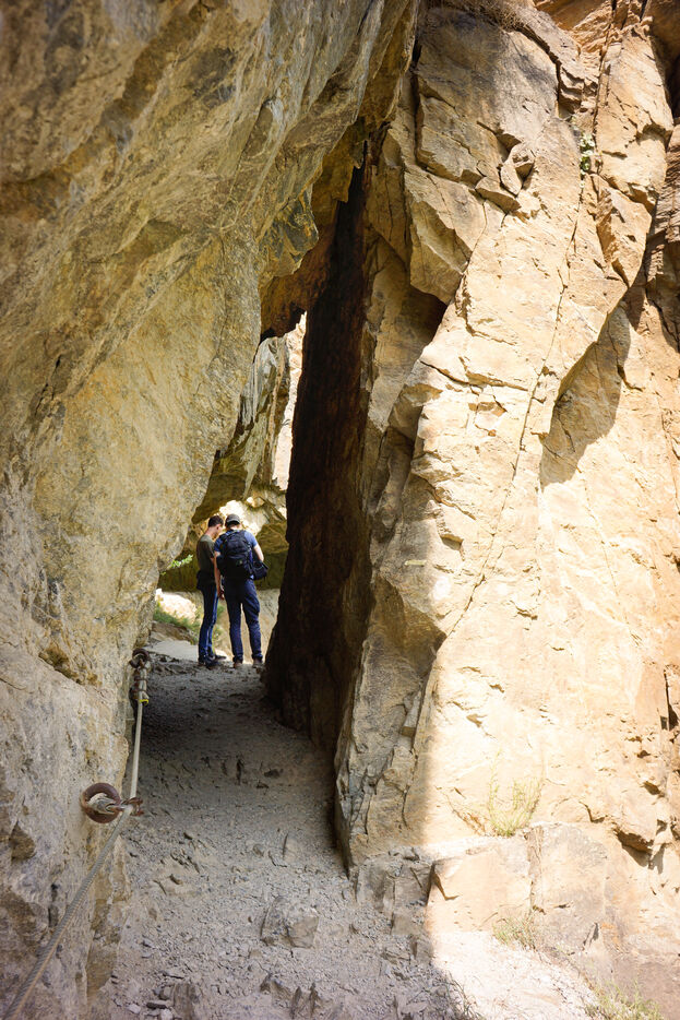 Le sentier principal, surnommé « l’itinéraire du vertige », longe les parois rocheuses à flanc de falaise, surplombant un torrent impétueux. Il alterne corniches étroites, passerelles métalliques, ponts suspendus et ponts de singe, offrant une expérience immersive et spectaculaire.