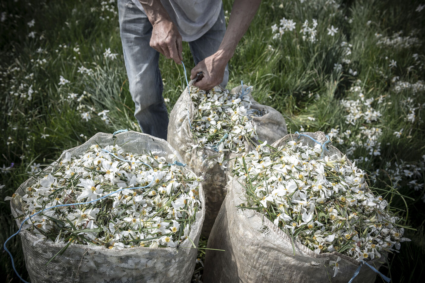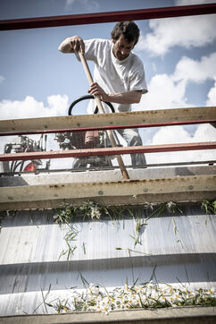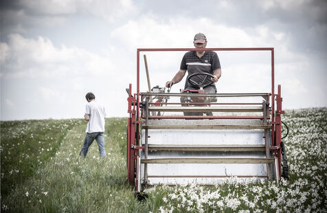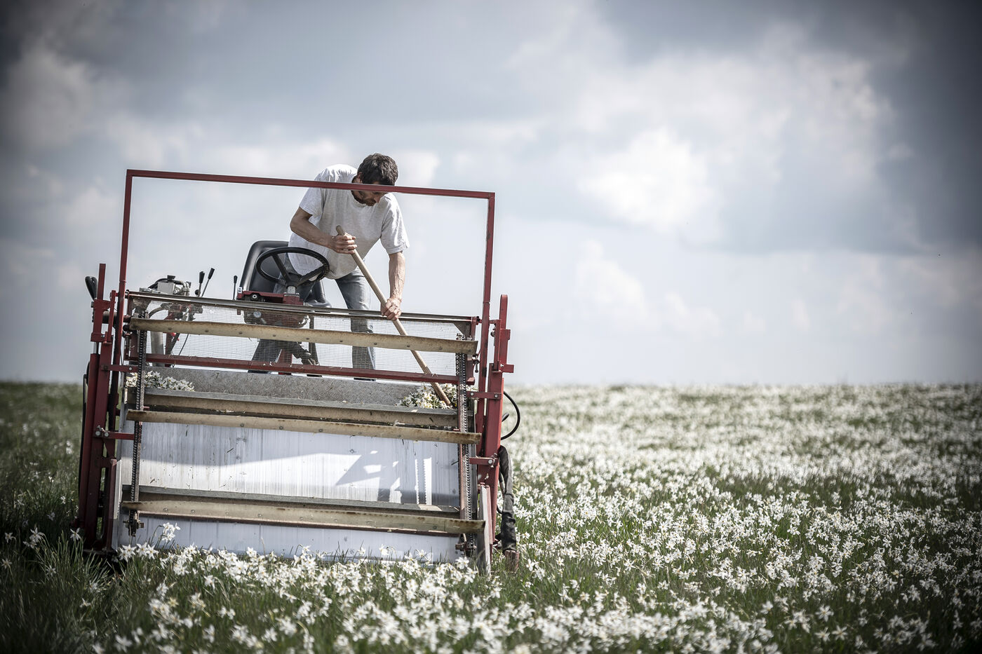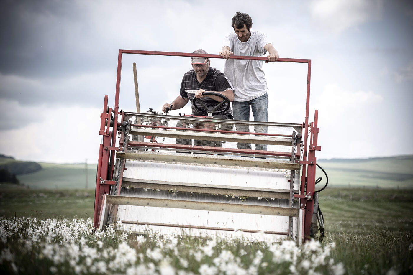 Mechanical harvesting of narcissus flowers in Aubrac. After processing, they will be used by the perfume industry.