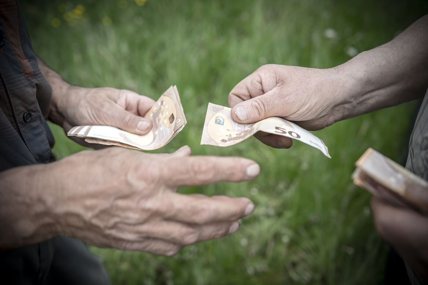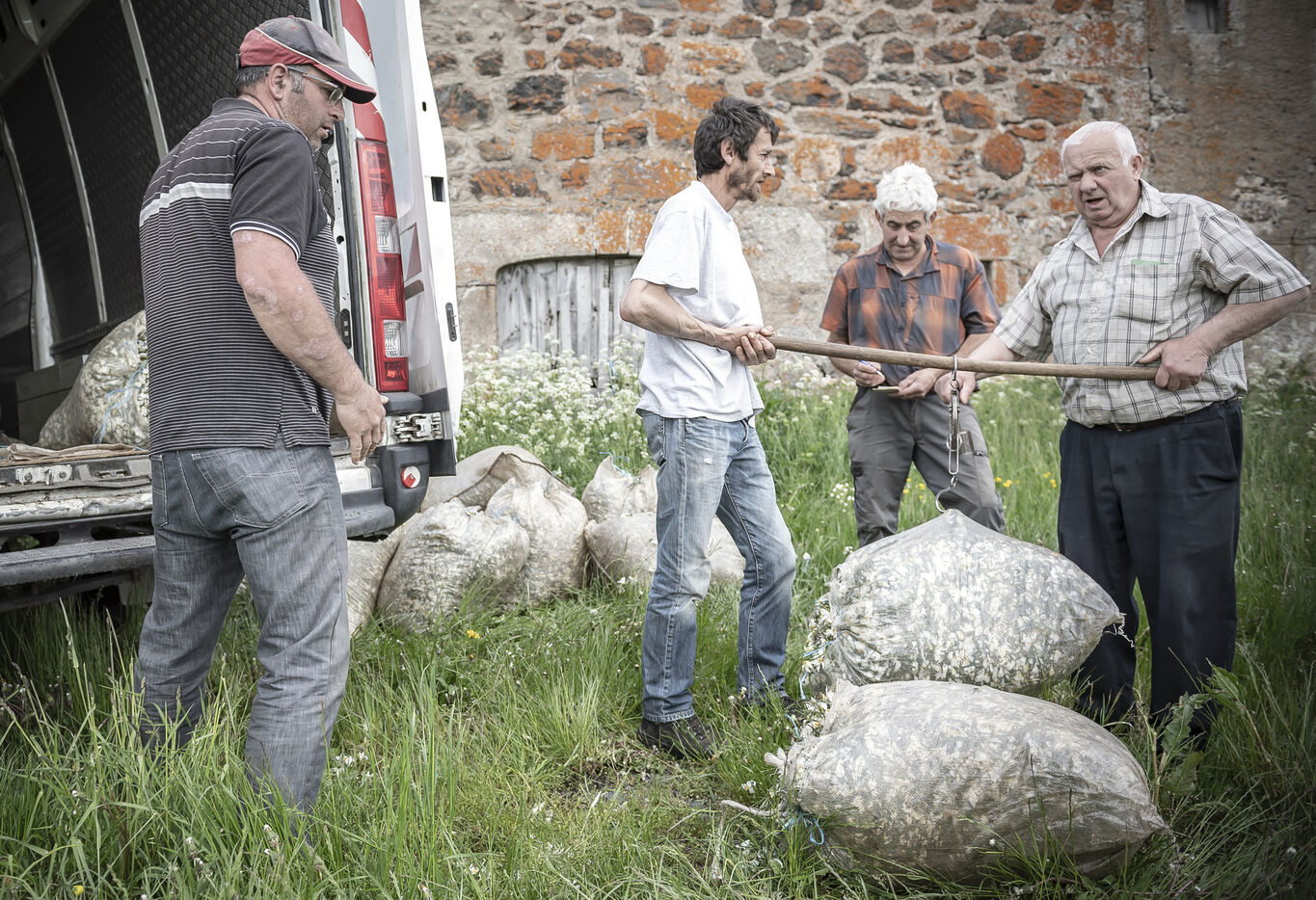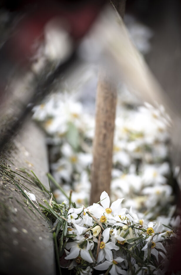 Mechanical harvesting of narcissus flowers in Aubrac. After processing, they will be used by the perfume industry.