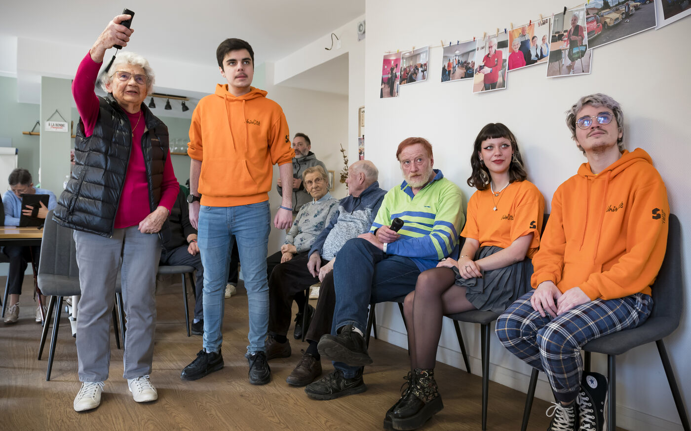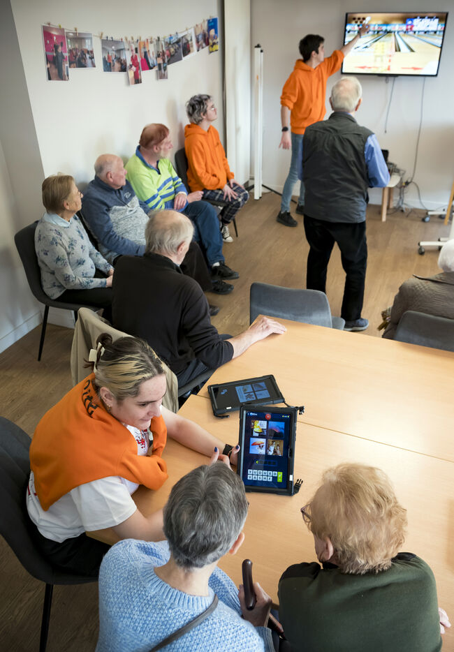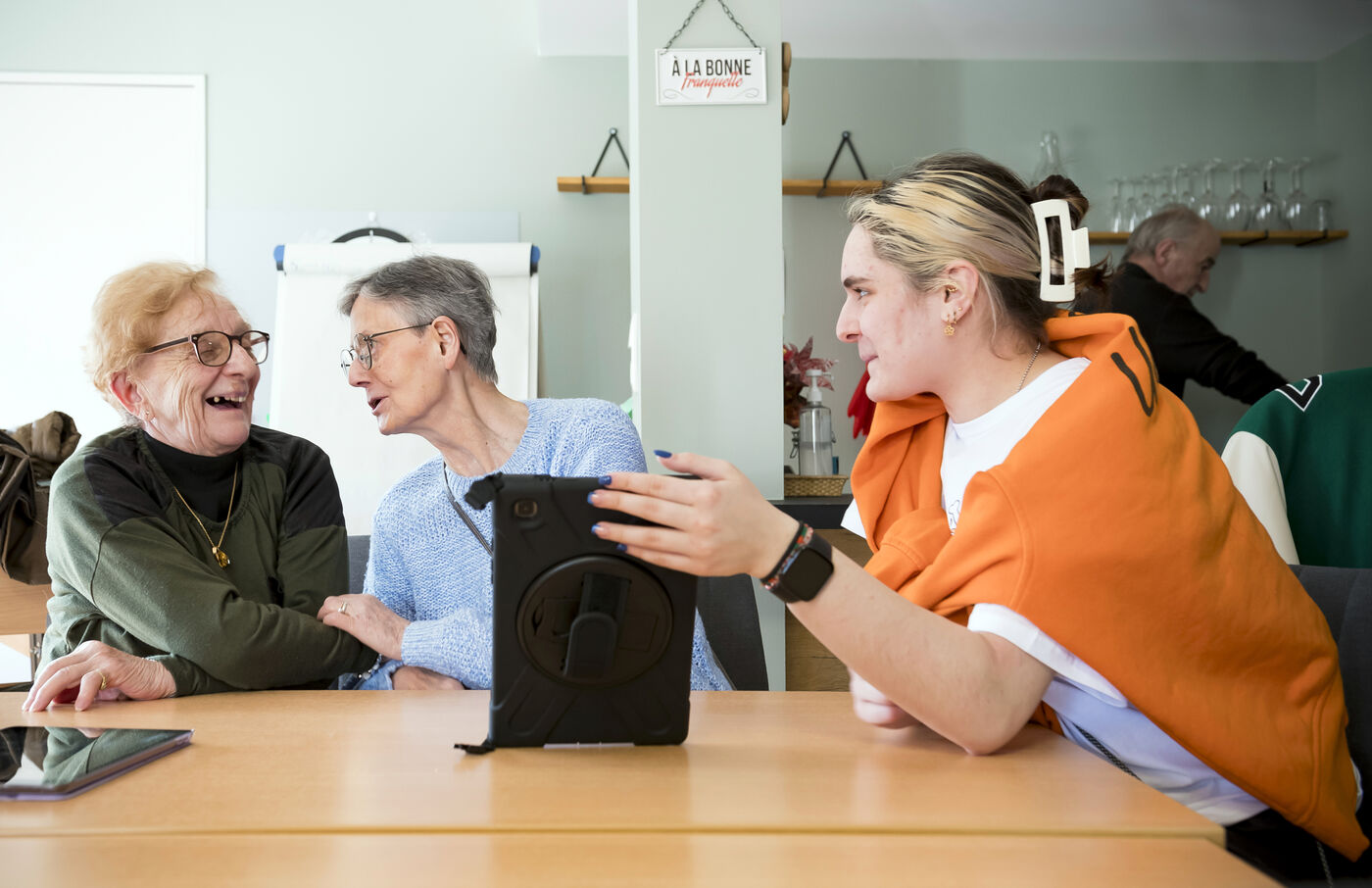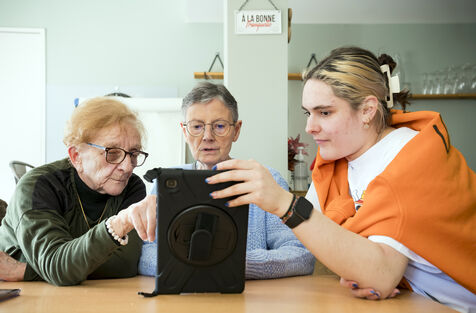 Personnes agées à l'entrainement aux jeux vidéos pour les championnats Silver Geek avec des jeunes du service civique. Le but est de stimuler leur cerveau et leur motricité grâce à l'aide des consoles et des tablettes de jeux.
