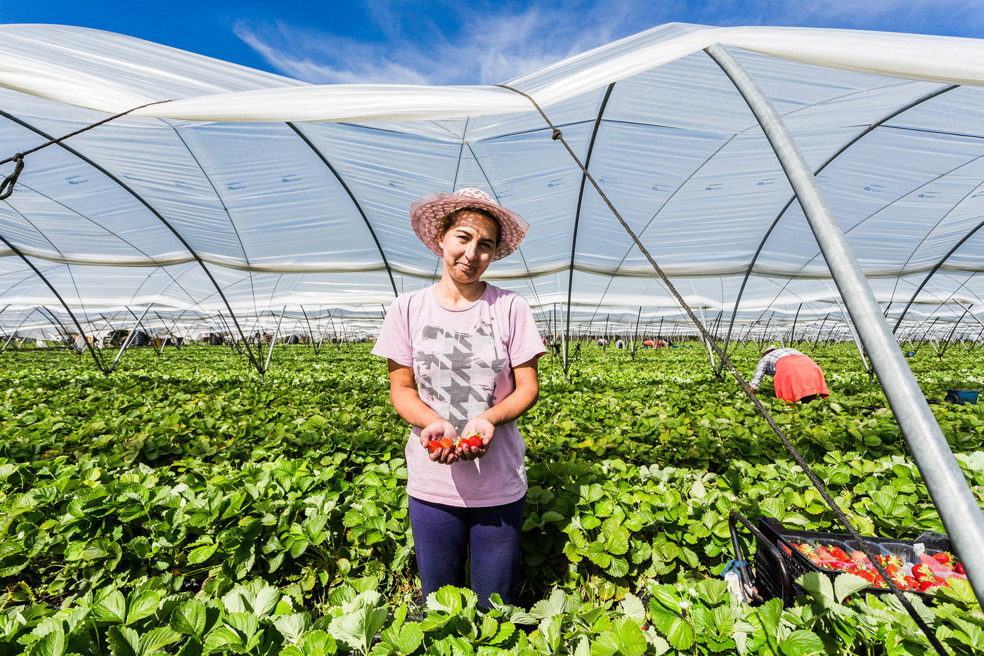Every year, 300,000 tons of strawberries are produced there, mainly Camorosa plants, a variety created in a laboratory in California. Planted in November, Huelva farmers harvest strawberries continuously for 4 to 6 months, from January to June. In order to harvest their fruit, the Andalusian producers call upon nearly 100,000 seasonal workers, mostly women, mostly from Eastern Europe and the Maghreb, every year. By day under the hot Andalusian sun or by night, their workers work for 37€/day, 7 days/week for 4 to 6 months. Although difficult, this work is nevertheless better paid than what the labour market offers in their country of origin and it is for this reason that the seasonal workers come back year after year, for more than 10 years for some of them...