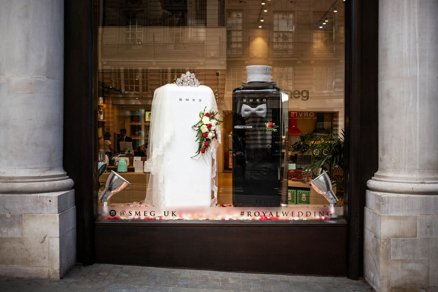 Drapeaux du Royaume Uni dans les rues, décoration de vitrines, vente de goodies, d'assiettes en porcelaine à l'effigie des futurs mariés, illustration d'une ville qui se prépare à son évènement royal.