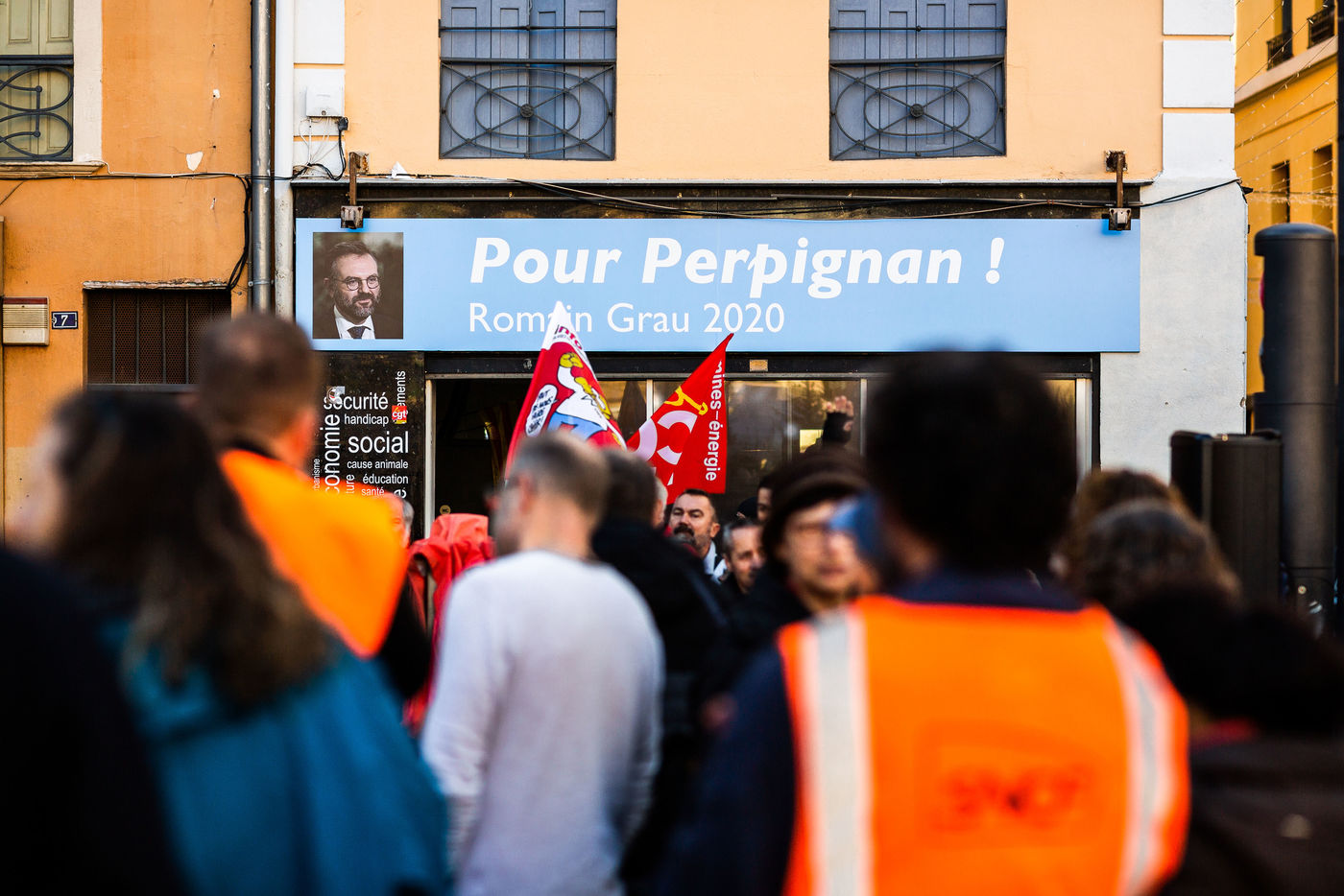 Rassemblement devant la permanence du depute La République En Marche - LREM de Perpignan, en Centre Ville, par les grevistes cheminots, les manifestants opposés à la réforme des retraites menée par le gouvernement Macron et les gilets jaunes.