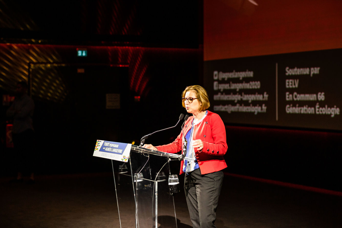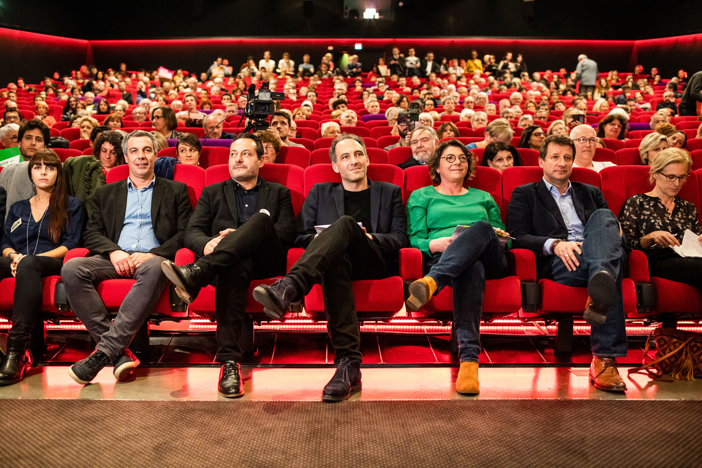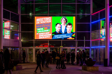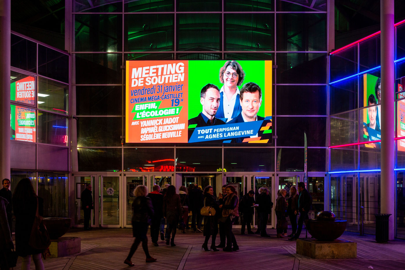 Environ 600 personnes etaient présentes au cinéma Le Méga Castillet, pour soutenir le campagne électorale d'Agnès Langevine pour la mairie de Perpignan, sous l'étiquette Europe Ecologie Les Verts et le slogan : "Enfin l'Ecologie".