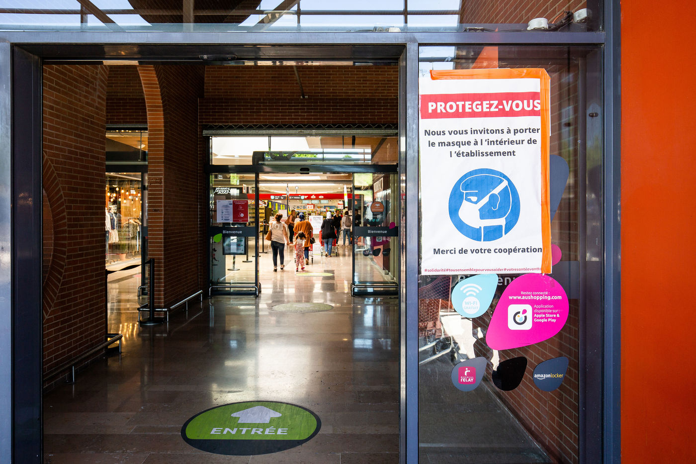 Rappel des gestes barrières, vente de masques, protection des caissières, reouverture des boutiques des galeries marchandes (...), ou comment s'organise un supermarché en période de déconfinement.