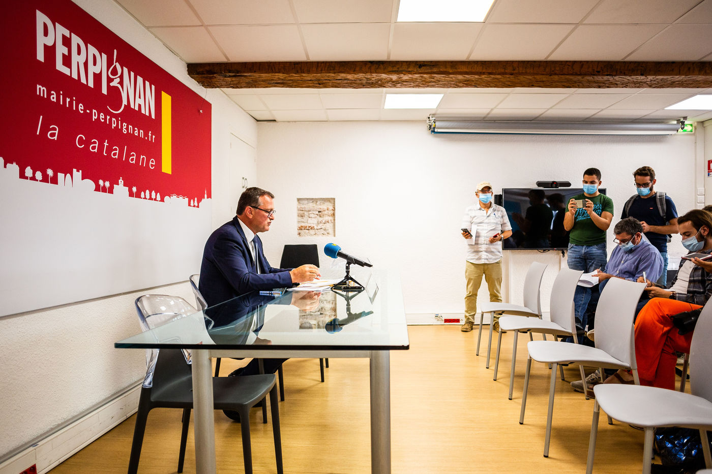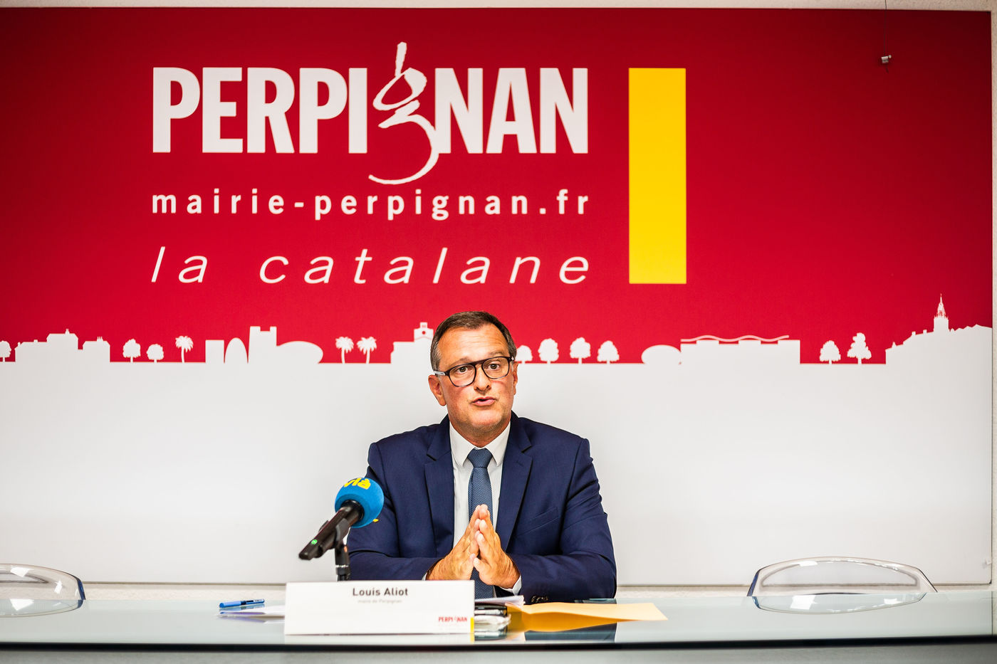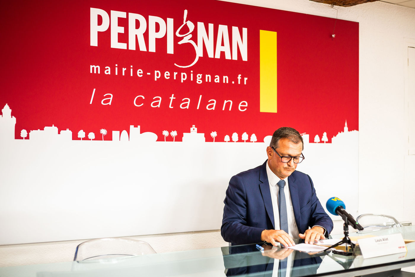 Perpignan, 15 septembre 2020, Conférence de presse de Louis Aliot, maire RN de Perpignan, suite à une course poursuite entre un homme armé d'une kalashnikov et les forces de l'ordre, elles aussi armes au poingt, devant 2 écoles primaire du centre-ville, rapidement fermées et sécurisés, à l'heure de pointe de la rentrée des élèves (lundi 14 septembre 2020 à 8h20/8h30).