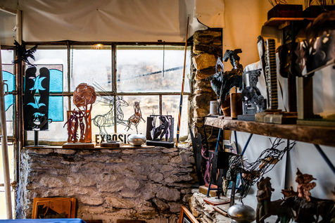ESPAGNE, automne 2020, Portrait de Philippe Lavall, artiste-sculpteur français vivant en catalogne espagnole, dans son atelier proche de la Seu d'Urgell. Formé dans l?atelier de joaillerie créative de son père, il va y apprendre le travail de la soudure, du poli, des métaux et des assemblages notamment en travaillant pour Salvador Dalí. P.Lavaill dans son atelier et ses oeuvres, à Bescaràn, entre Cerdanya et Cadí.