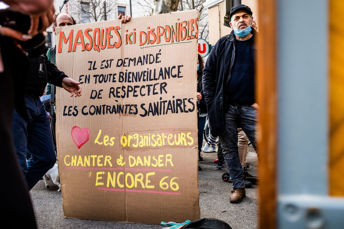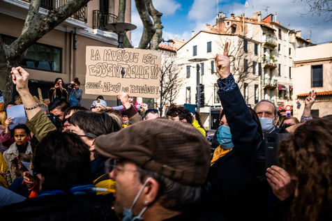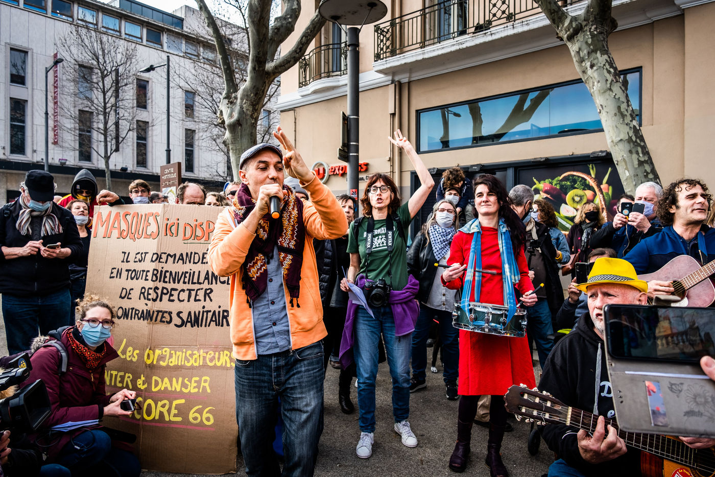 Perpignan et Prades, 19 février 2021, manifestation CGT et Alternatiba, en présence du chanteur HK venu soutenir les acteurs du spectacle vivant rapidement transformée en concert public.