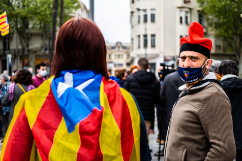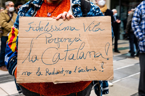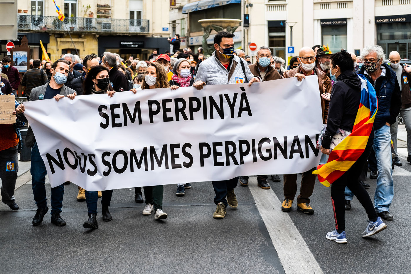 Perpignan, 10 April 2021, demonstration against the new name and logo of the city of Perpignan, Perpignan La Rayonnante and the suppression of its suffix La Catalane. Decision of the Mayor of Perpignan Louis Aliot and his communication department. Rally organised by associations defending Catalan culture, including Oui au Pays Catalan, who are calling for a referendum "so that our city continues to be La Catalane - La Catalana".