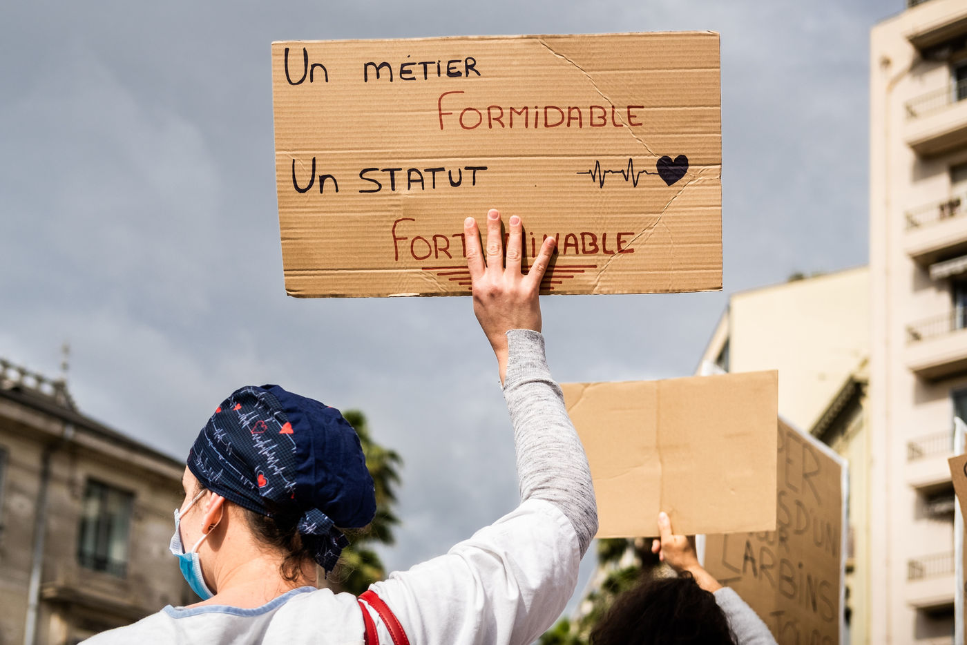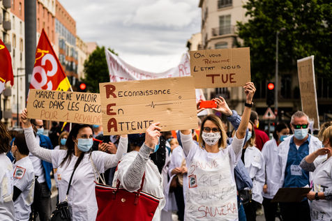11 mai 2021, Perpignan, Rassemblement et manifestation des personnels de réanimation de l'hôpital de Perpignan, revendiquant une revalorisation de salaire et une meilleure reconnaissance face à leur travail, en particulier durant la pandémie de covid 19.