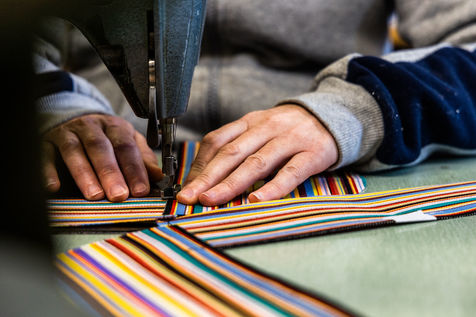Découpe du tissus, cloutage, collage, semellage et autres étapes de préparation d'une chaussure en toile devenue patrimoine.