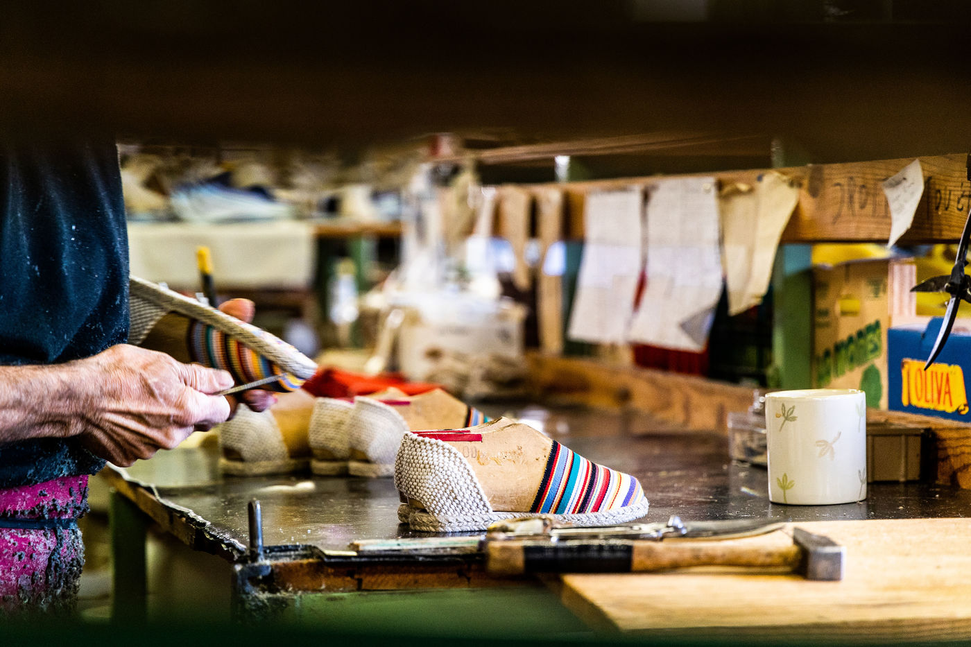 Saint Laurent de Cerdans, atelier Création Catalane, Avril 2022, Retour de l'espadrille et de la Vigatana catalane, sur ces terres, dans l'atelier qui a vu naitre et prospérer l'économie de la chaussure historique et traditionnelle de l'Est des Pyrénées.