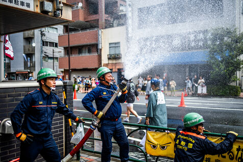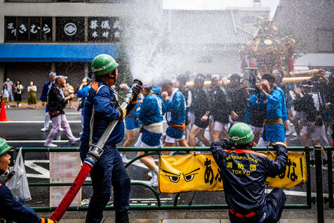 Tokyo, August 13, 2023, Fukagawa Hachiman Matsuri Festival, the largest annual summer festival at Tomioka Hachiman-gu Shrine in Tokyo's Monzen-nakacho district, one of the 3 biggest religious festivals in the Tokyo megalopolis. A procession of sacred palanquins called mikoshi, carried by members of the various temples they represent, and which, as they pass, are showered copiously and cheerfully by spectators, city firemen and other participants.