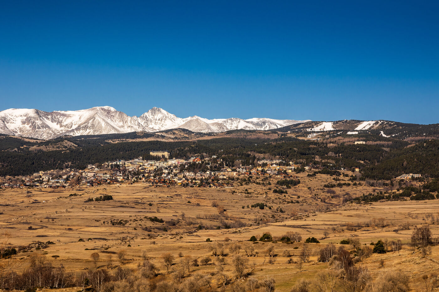 Cerdagne, Pyrénées-Orientales, 13 février 2024, au 2eme jour des vacances scolaire d'hiver 2024, les Pyrénées, comme la plupart des massifs montagneux français, manquent cruellement de neige. Malgré tout, les stations de ski, ouvertes, comptent sur l'afflux de touristes.