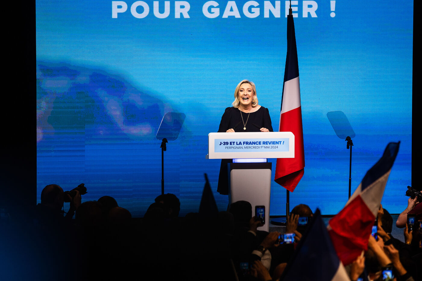 Perpignan, 1er Mai 2024, Dans le cadre de sa campagne pour les elections europeennes du 9 juin 2024, le Rassemblement National mene par Jordan Bardella et Marine Le Pen tient son meeting a Perpignan, ville de Louis Aliot, maire RN de la ville.