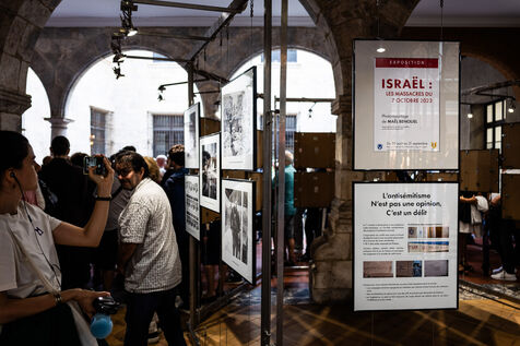 Perpignan, August 29, 2025. Taking advantage of the launch of the 37th edition of the Visa pour l'Image international photojournalism festival, the Perpignan city council, led by its mayor, vice-president of the RN (Rassemblement National), is presenting an exhibition—outside the festival—in the courtyard of City Hall on the massacres of October 7, 2023, in Israel.