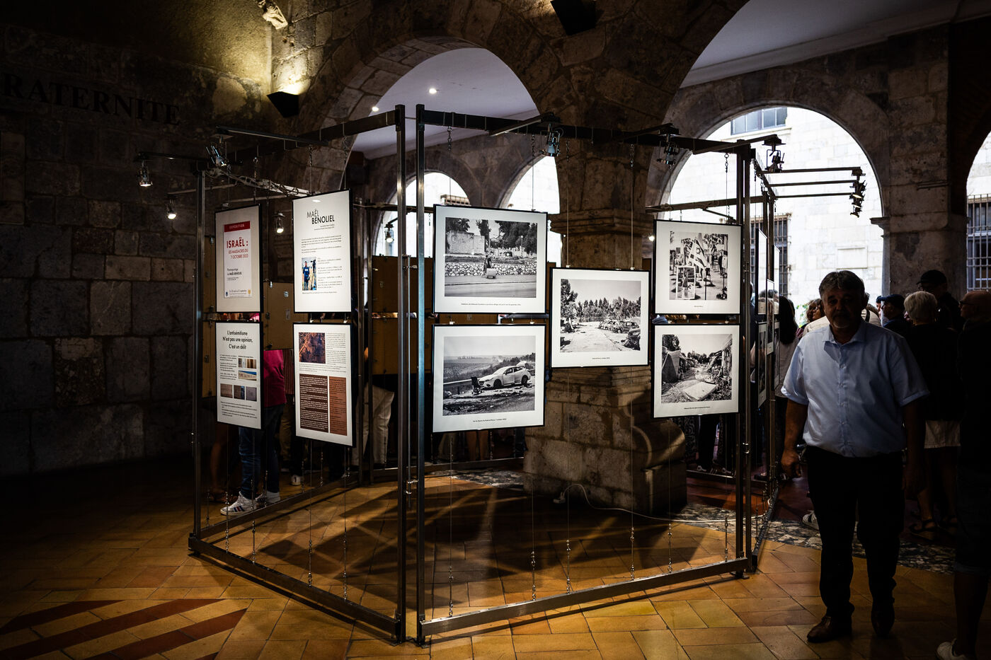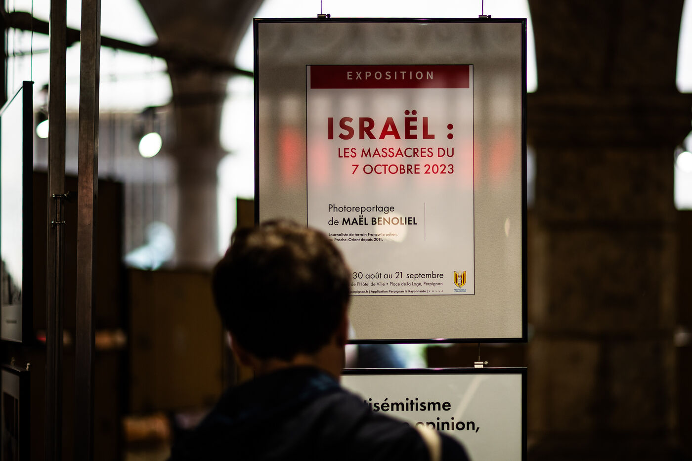 Perpignan, 29 aout 2025, profitant du lancement de la 37eme édition du festival international du photojournalisme Visa pour l'Image, la mairie de Perpignan sous l'impulsion de son maire, vice-président du RN (Rassemblement National), Louis Aliot, présente une exposition - hors festival - dans le patio de l'hotel de ville sur les massacres du 7 octobre 2023 en Israël.