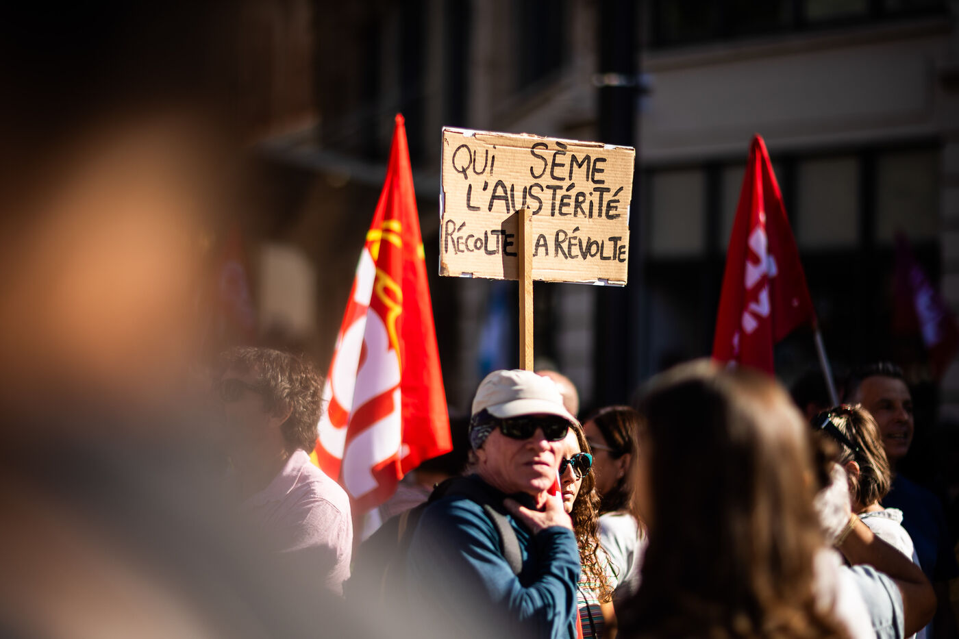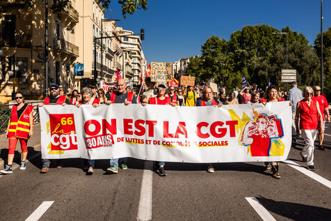 Perpignan, 18 septembre 2025, manifestation à l'appel de l'intersyndicale pour plus de justice sociale, contre le budget et l'austérité annoncés par le gouvernement. Une rentrée sociale faisant suite à la colère populaire du mouvement "Bloquons Tout le 10 septembre".