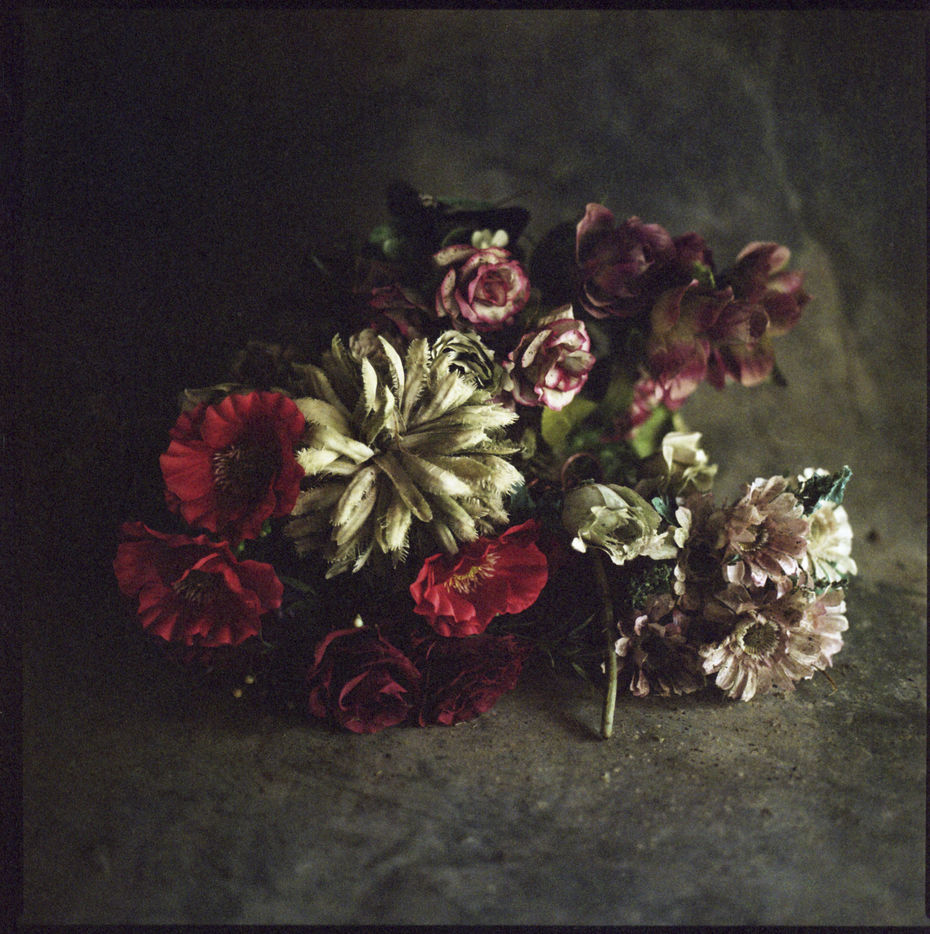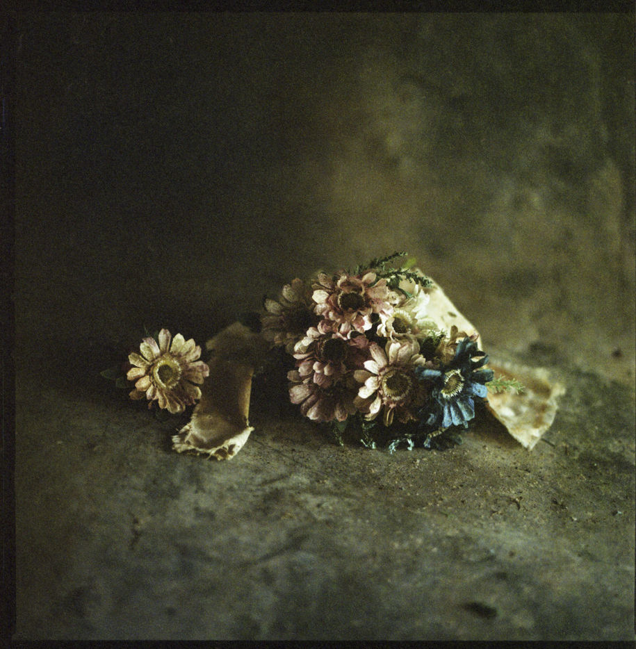 Plastic flowers thrown in the vegetation near cemeteries, elements collected on the shore.