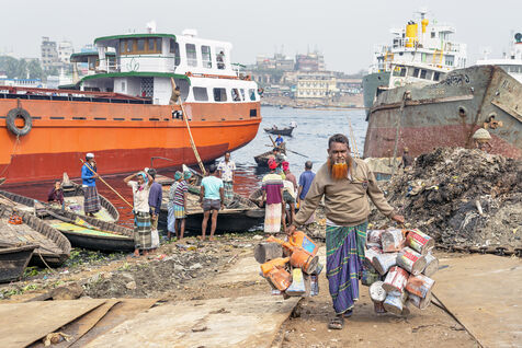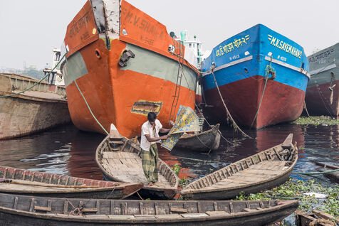 Bangladesh is said to be the land of water, with rivers and streams often several kilometers wide, flowing in all directions and constituting widely-used communication routes. Dhaka, located in the center of the country, has several major ports. On the banks of the Buriganga River, one of the most polluted in the world due to the numerous factories along its banks, notably textile factories, is the Sadarghat shipyard, where numerous ships are maintained and repaired.