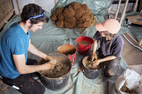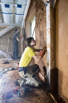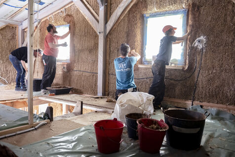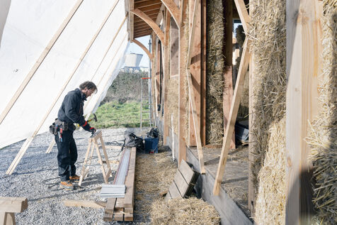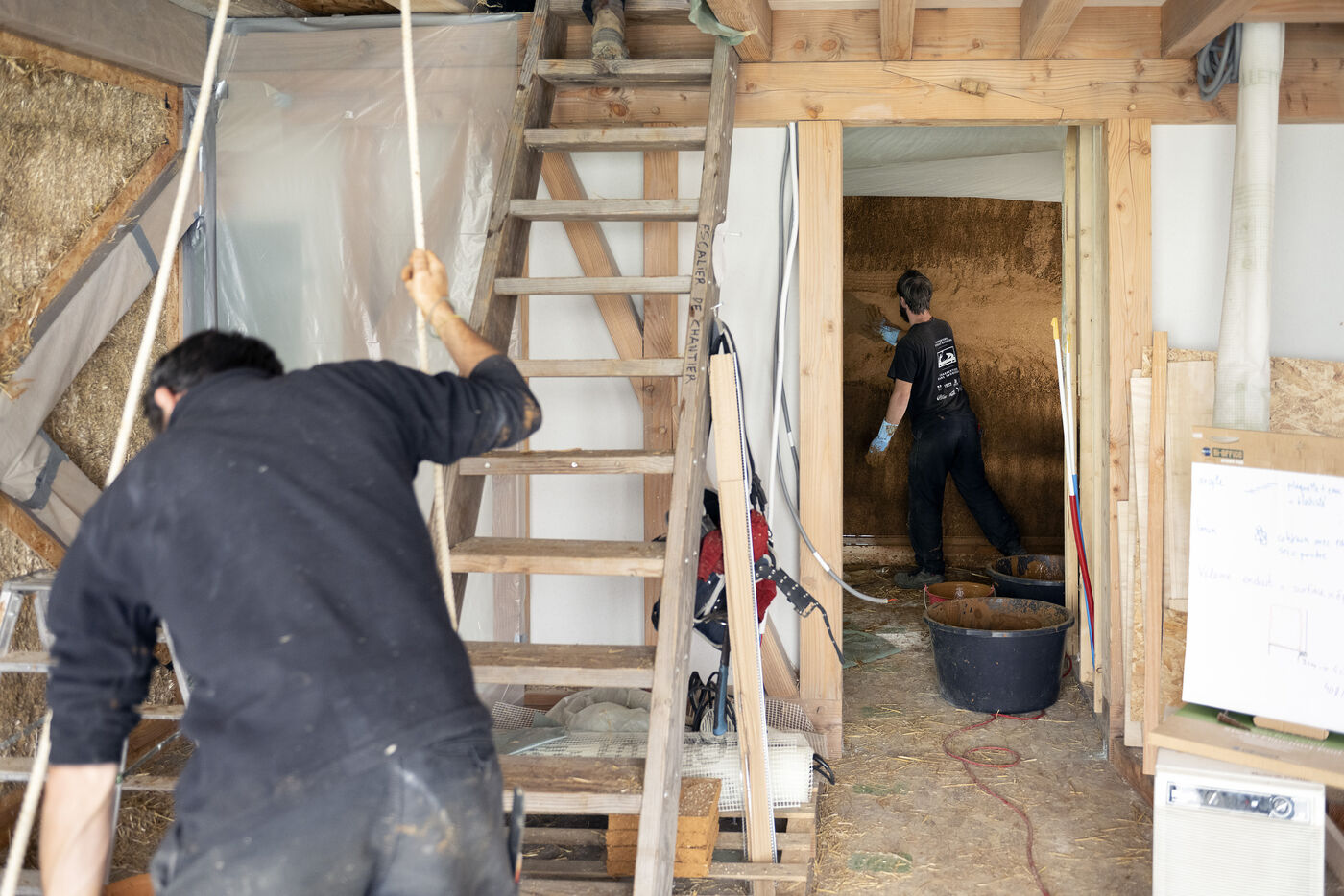 Pour diminuer le coût de leur construction, les propriétaires se réservent souvent certains travaux, effectués sous formes de chantiers participatifs où l'entraide est de mise. Ici on peut suivre quelques étapes de la construction de la maison d'Aurélien, co-fondateur de la Scop qui compte 9 associés. Le travail se fait entre amis et avec beaucoup de bonne humeur et de convivialité.