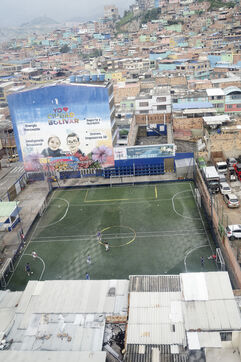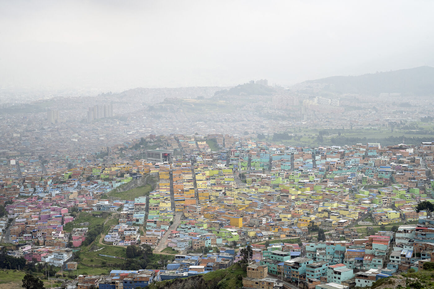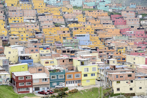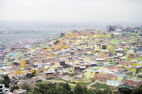 Lovée dans une vallée de la Cordillère des Andes, Bogota s'étire sur une trentaine de kilomètres. A sa périphérie les plus pauvres ont construit des bidonvilles qui escaladent les pentes escarpées des montagnes dont Ciudad Bolivar est un exemple de plus de 600 000 habitants.