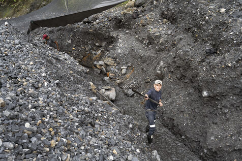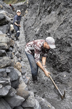 Dans les exploitations artisanales, le travail se fait à la pioche, à la pelle, à la barre à mine, parfois avec des explosifs et des marteaux piqueurs. Hommes et femmes creusent, s’enfoncent dans les montagnes, extraient et charrient des tonnes de schistes noirs à la recherche des veines de calcite plus claires où se logent les pierres précieuses.
