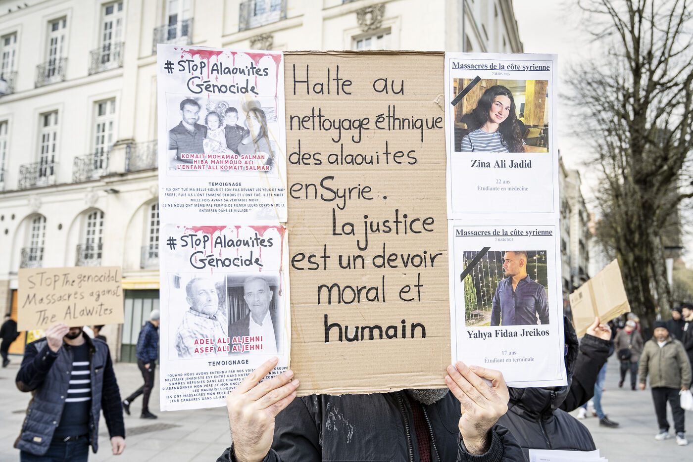 Des membres de la communauté alaouite se sont joints à la manifestation pour demander à ce que cessent les massacres de leur minorité religieuse musulmane en Syrie.