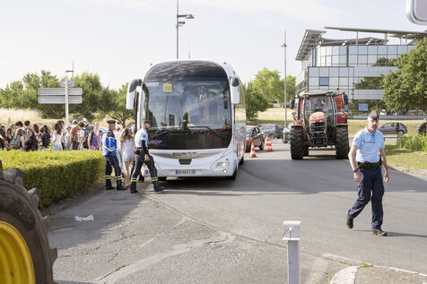 Des agriculteurs de la FNSEA, de la Coordination Rurale (CR) et des Jeunes Agriculteurs (JA) bloquent les entrées du Futuroscope pour protester contre les restrictions d'usages de l'eau qui vont peut-être leur être imposées à la suite des études du HMUC (Hydrologie, Milieux, Usages et Climat).
