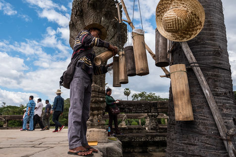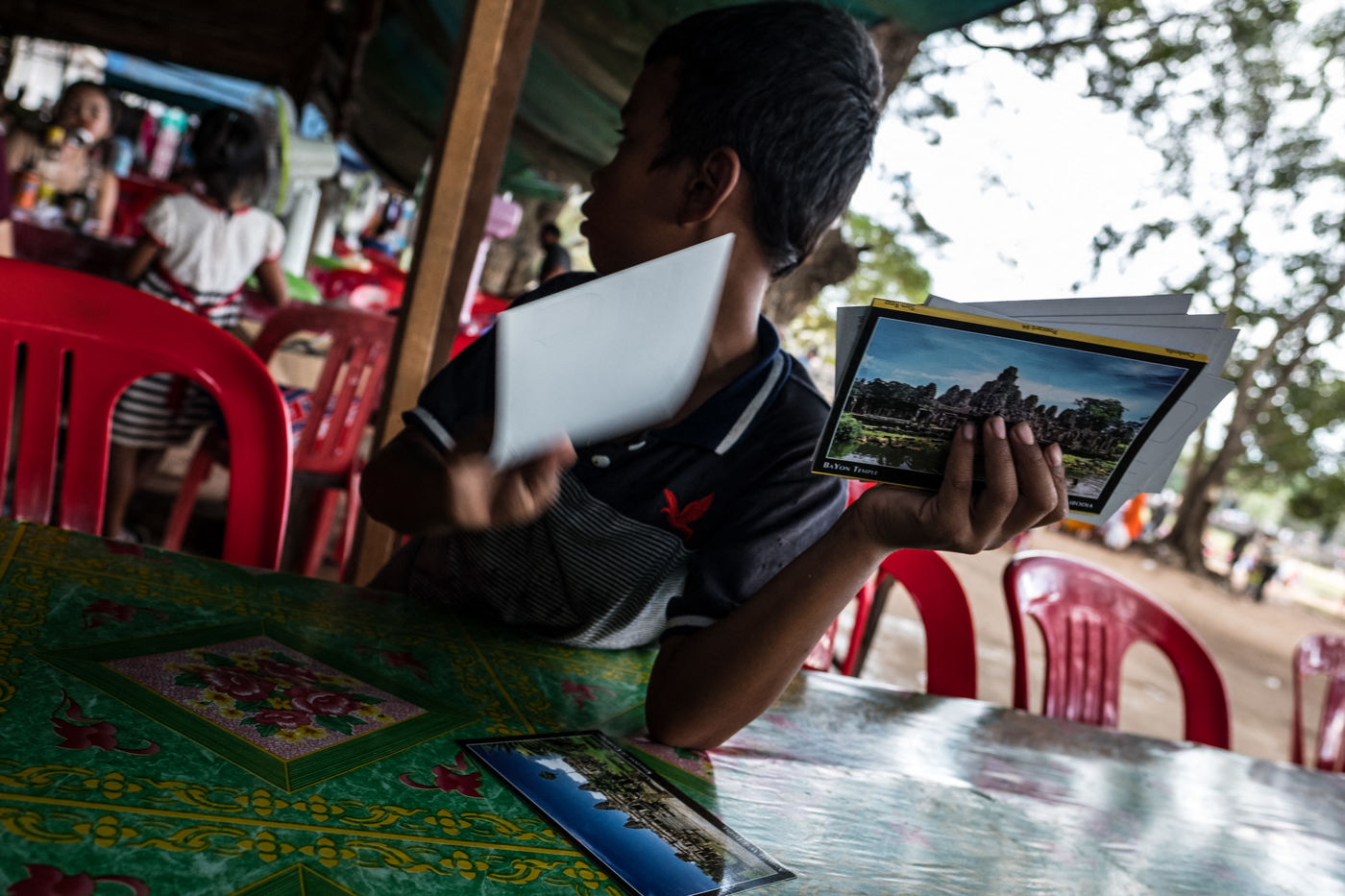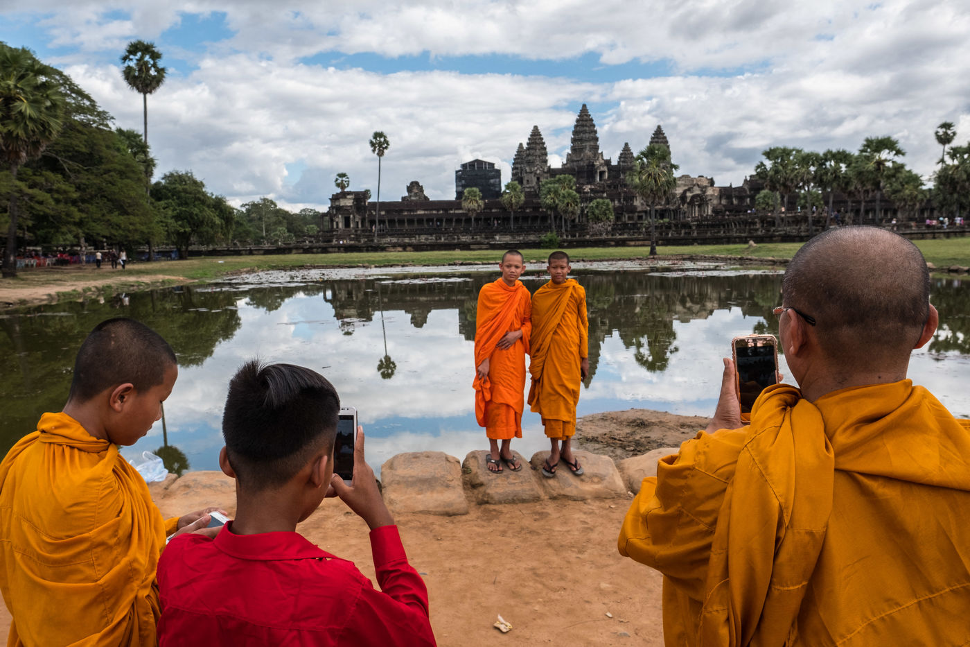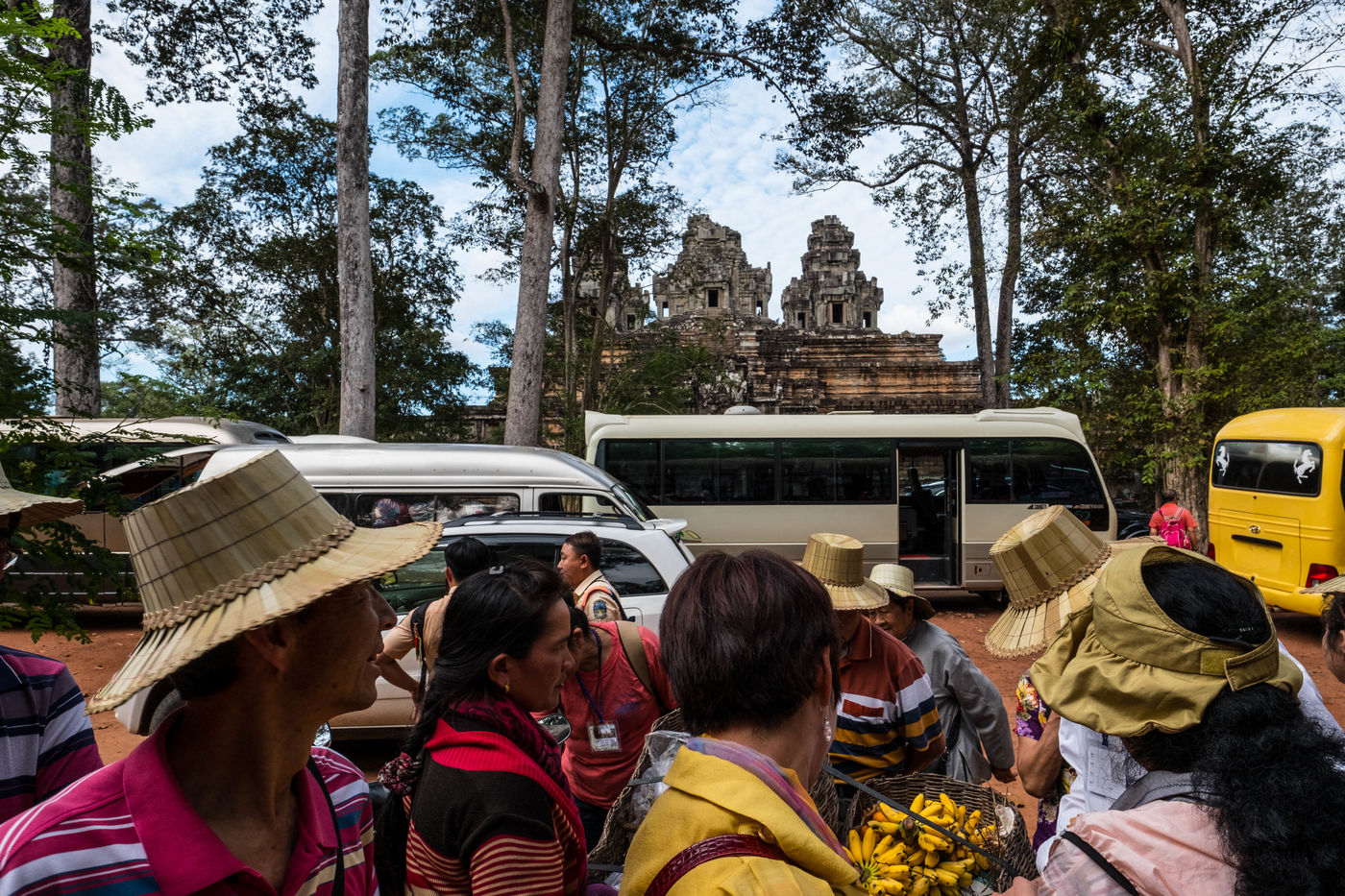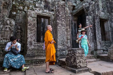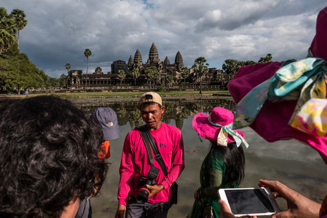 À cette foule s'ajoutent les Cambodgiens qui tentent de profiter de cette manne financière en vendant des boissons et en dirigeant les visiteurs vers les magasins de souvenirs. Leurs enfants, plutôt que d'être à l'école, sont mis également à contribution et vendent cartes postales et autres babioles.