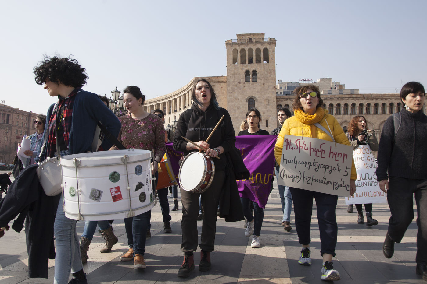 Deux jours après le meurtre d'une mère et le passage à tabac de sa fille de 13 ans. Les féministes sont déterminés à faire entendre leur voix. Yerevan, 8 mars 2020.